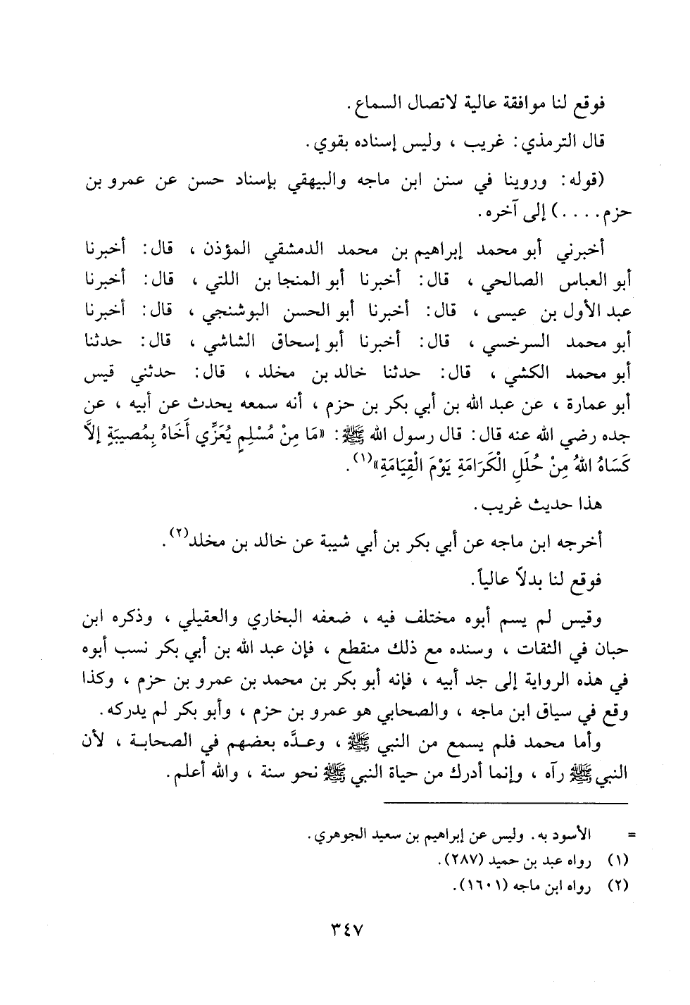 أخبرني أبو محمد إبراهيم بن محمد الدمشقي المؤذن، قال: أخبرنا أبو العباس الصالحي، قال: أخبرنا أبو المنجا بن اللتي، قال: أخبرنا عبد الأول بن عيسى، قال: أخبرنا أبو الحسن البوشنجي، قال: أخبرنا أبو محمد السرخسي، قال: أخبرنا أبو إسحاق الشاشي، قال: حدثنا أبو محمد الكشي، قال: حدثنا خالد بن مخلد، قال: حدثني قيس أبو عمارة، عن عبد الله بن أبي بكر بن حزم، أنه سمعه يحدث عن أبيه، عن جده رضي الله عنه قال: قال رسول الله صلى الله عليه وسلم: ((ما من مسلمٍ يعزي أخاه بمصيبةٍ إلا كساه الله من حلل الكرامة يوم القيامة)).