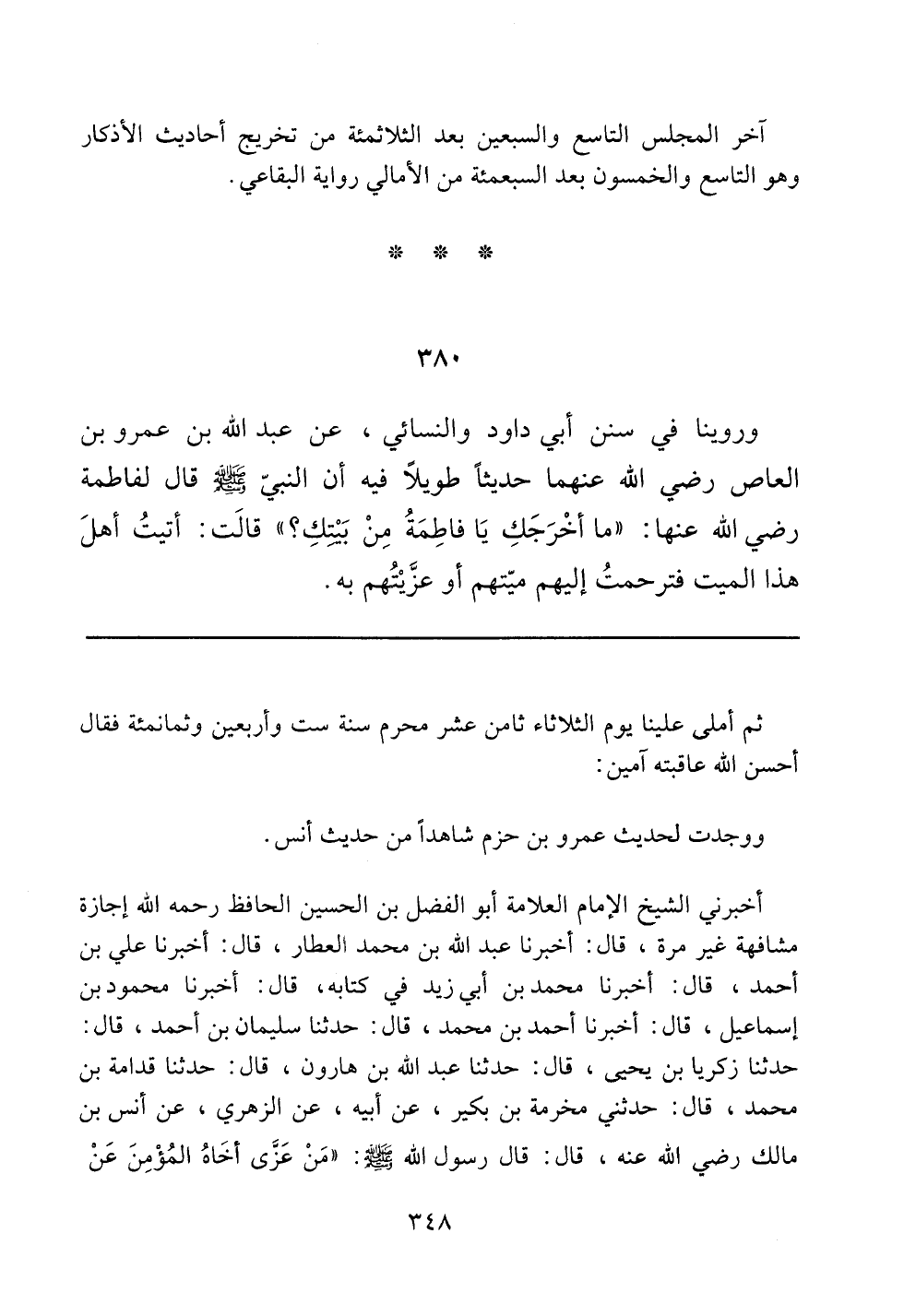 آخر المجلس التاسع والسبعين بعد الثلاثمئة من تخريج أحاديث الأذكار وهو التاسع والخمسون بعد السبعمئة من الأمالي رواية البقاعي.