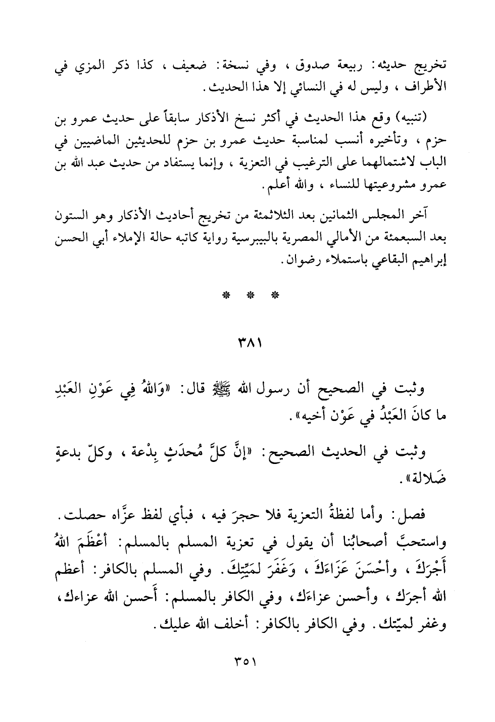 (تنبيه) وقع هذا الحديث في أكثر نسخ الأذكار سابقاً على حديث عمرو بن حزم، وتأخيره أنسب لمناسبة حديث عمرو بن حزم للحديثين الماضيين في الباب لاشتمالهما على الترغيب في التعزية، وإنما يستفاد من حديث عبد الله بن عمرو مشروعيتها للنساء، والله أعلم.