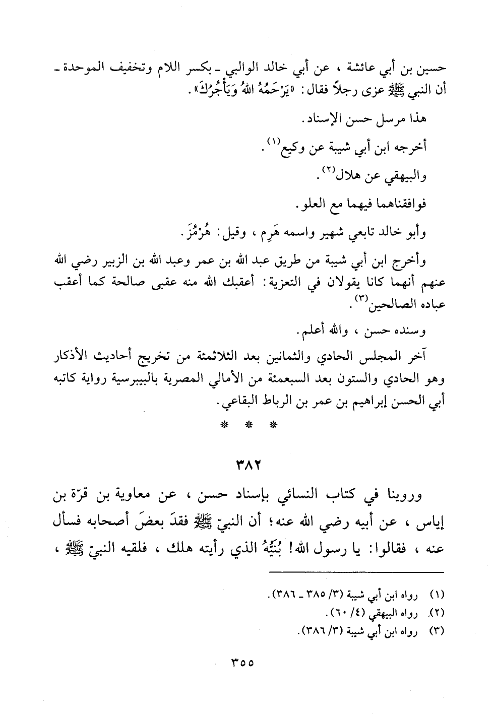 [[وروينا في كتاب النسائي بإسناد حسن، عن معاوية بن قرة بن إياس، عن أبيه رضي الله عنه؛ أن النبي صلى الله عليه وسلم فقد بعض أصحابه فسأل عنه، فقالوا: يا رسول الله! بنيه الذي رأيته هلك، فلقيه النبي صلى الله عليه وسلم،