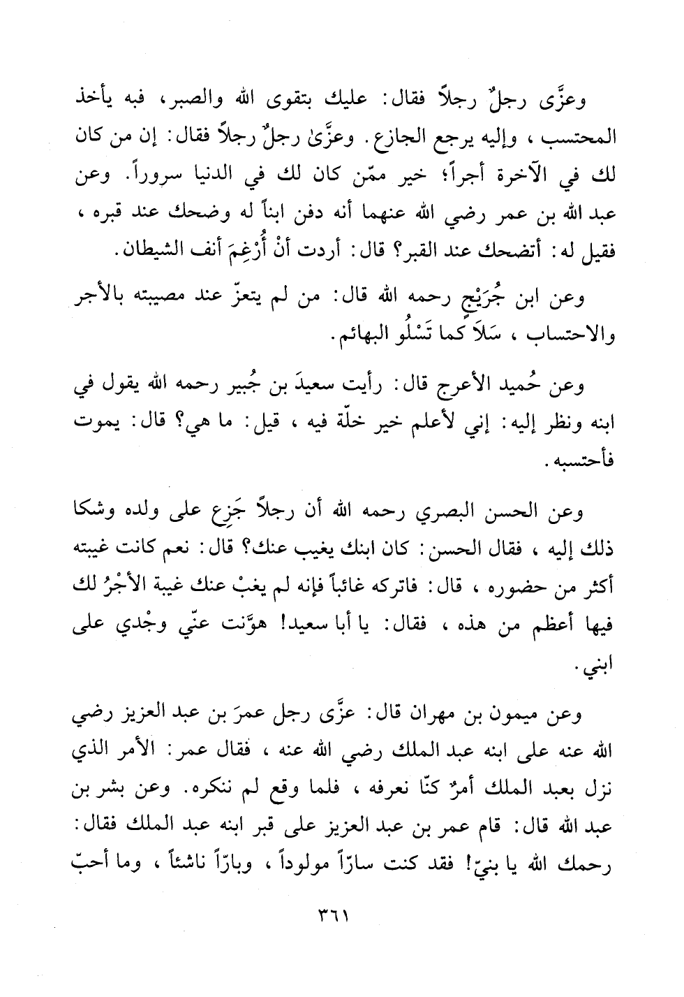 وعزى رجلاً فقال: عليك بتقوى الله والصبر، فبه يأخذ المحتسب، وإليه يرجع الجازع، وعزى رجلٌ رجلاً فقال: إن من كان لك في الآخرة أجراً؛ خير ممن كان لك في الدنيا سروراً. وعن عبد الله بن عمر رضي الله عنهما أنه دفن ابناً له وضحك عند قبره، فقيل له: أتضحك عند القبر؟ قال: أردت أن أرغم أنف الشيطان.