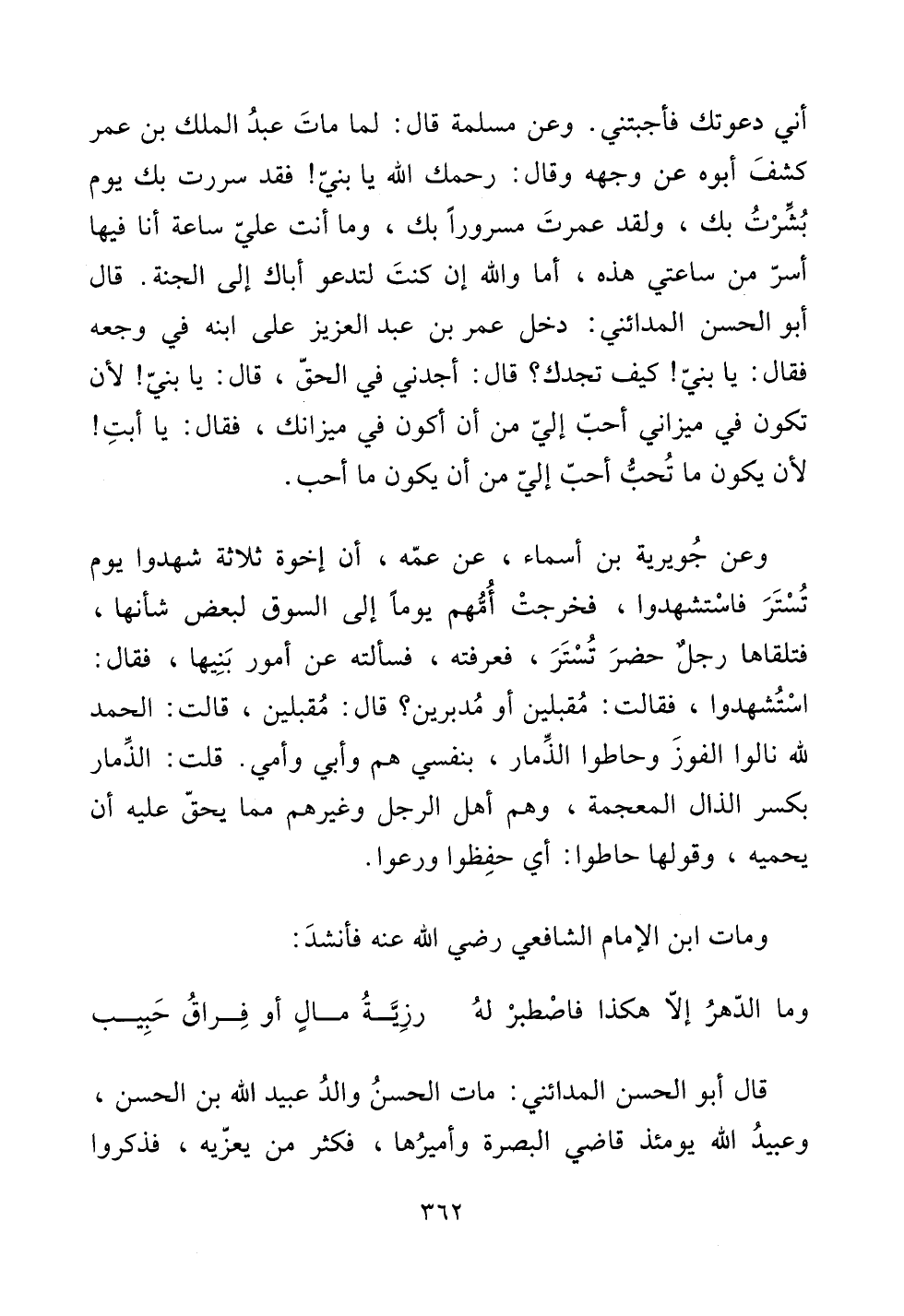 أني دعوتك فأجبتني. وعن مسلمة قال: لما مات عبد الملك بن عمر كشف أبوه عن وجهه وقال: رحمك الله يا بني! فقد سررت بك يوم بشرت بك، ولقد عمرت مسروراً بك، وما أنت علي ساعة أنا فيها أسر من ساعتي هذه، أما والله إن كنت لتدعو أباك إلى الجنة. قال أبو الحسن المدائني: دخل عمر بن عبد العزيز على ابنه في وجعه فقال: يا بني! كيف تجدك؟ قال: أجدني في الحق، قال: يا بني! لأن تكون في ميزاني أحب إلي من أن أكون في ميزانك، فقال: يا أبت! لأن يكون ما تحب أحب إلي من أن يكون ما أحب.