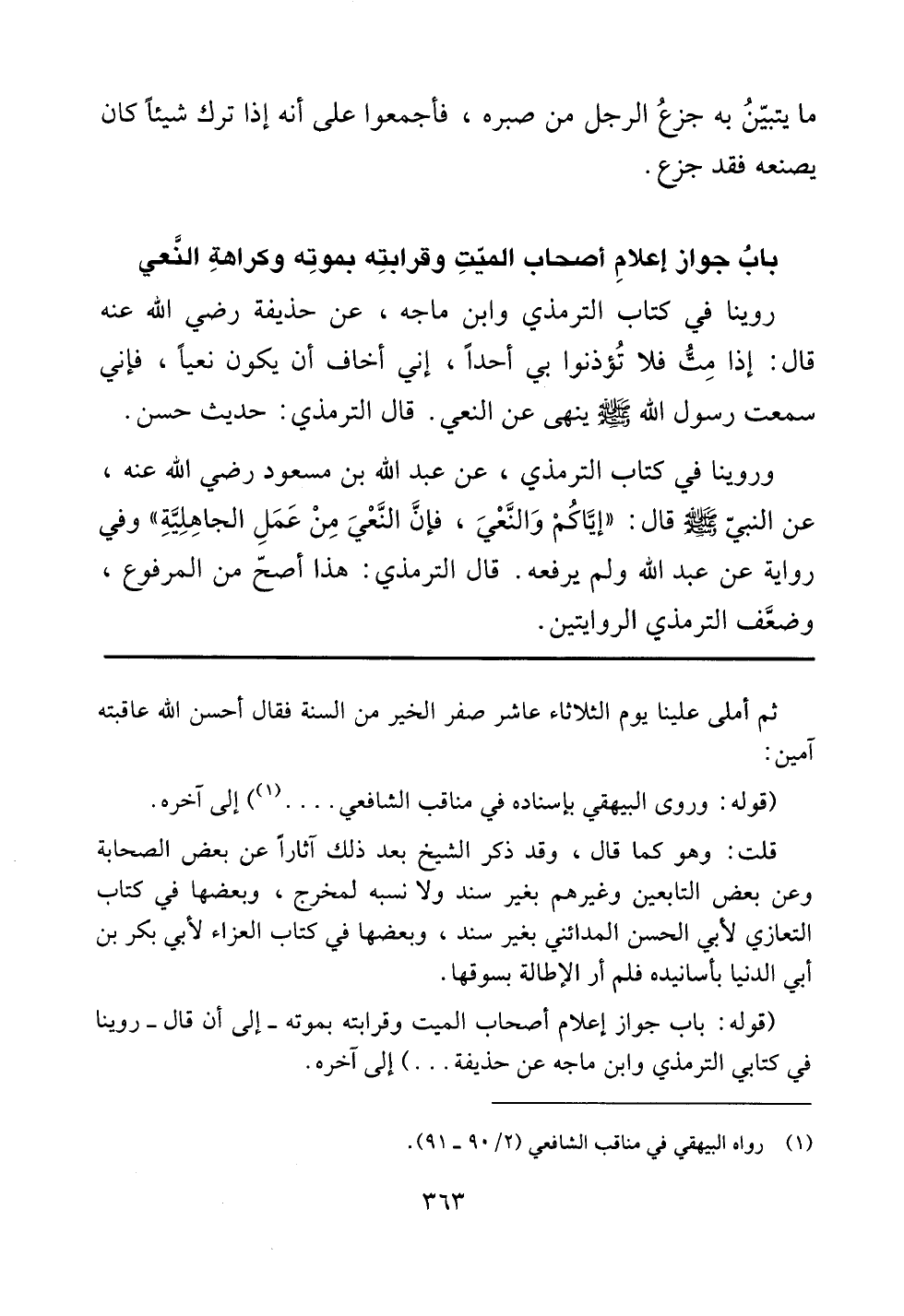 روينا في كتاب الترمذي وابن ماجه، عن حذيفة رضي الله عنه قال: إذا مت فلا تؤذنوا بي أحداً، إني أخاف أن يكون نعياً، فإني سمعت رسول الله صلى الله عليه وسلم ينهى عن النعي. قال الترمذي: حديث حسن.
