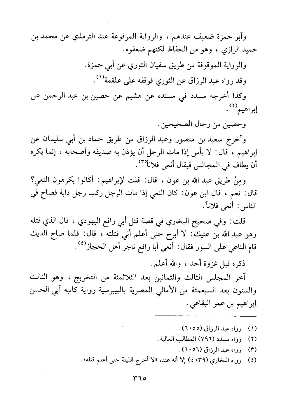 ومن طريق عبد الله بن عون، قال: قلت لإبراهيم: أكانوا يكرهون النعي؟ قال: نعم، قال ابن عون: كان النعي إذا مات الرجل ركب رجل دابة فصاح في الناس: أنعى فلاناً.