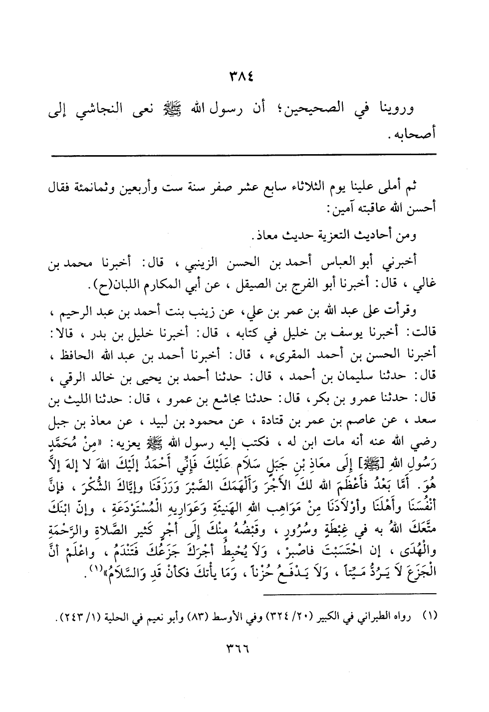 وقرأت على عبد الله بن عمر بن علي، عن زينب بنت أحمد بن عبد الرحيم، قالت: أخبرنا يوسف بن خليل في كتابه، قال: أخبرنا خليل بن بدر، قالا: أخبرنا الحسن بن أحمد المقرئ، قال: أخبرنا أحمد بن عبد الله الحافظ، قال: حدثنا سليمان بن أحمد، قال: حدثنا أحمد بن يحيى بن خالد الرقي، قال: حدثنا عمرو بن بكر، قال: حدثنا مجاشع بن عمرو، قال: حدثنا الليث بن سعد، عن عاصم بن عمر بن قتادة، عن محمود بن لبيد، عن معاذ بن جبل رضي الله عنه أنه مات ابن له، فكتب إليه رسول الله صلى الله عليه وسلم يعزيه: ((من محمد رسول الله [صلى الله عليه وسلم] إلى معاذ بن جبلٍ سلام عليك فإني أحمد إليك الله لا إله إلا هو. أما بعد فأعظم الله لك الأجر وألهمك الصبر ورزقنا وإياك الشكر، فإن أنفسنا وأهلنا وأولادنا من مواهب الله الهنيئة وعواريه المستودعة، وإن ابنك متعك الله به في غبطةٍ وسرورٍ، وقبضه منك إلى أجرٍ كثير الصلاة والرحمة والهدى، إن احتسبت فاصبر، ولا يحبط أجرك جزعك فتندم، واعلم أن الجزع لا يرد ميتاً، ولا يدفع حزناً، وما يأتك فكأن قد والسلام)).