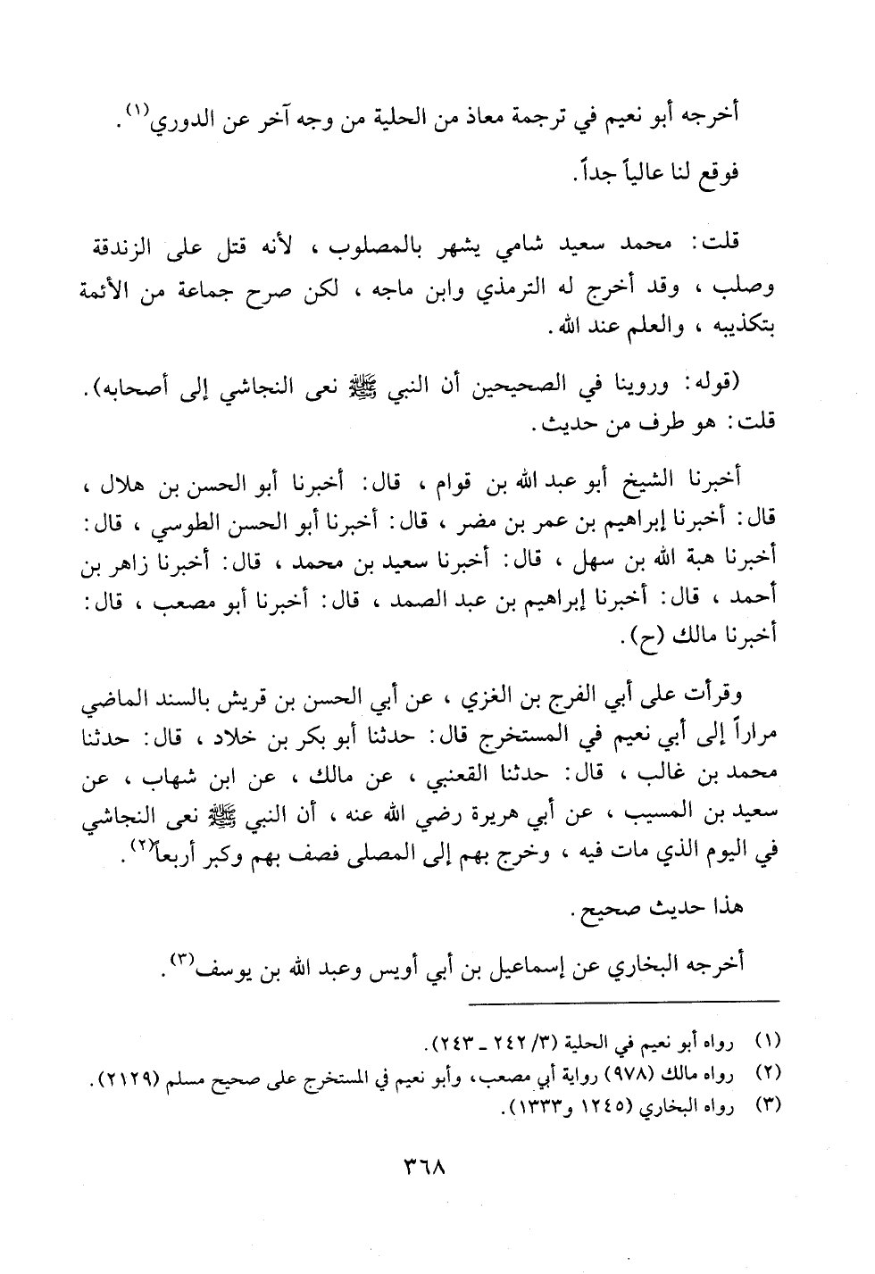 وقرأت على أبي الفرج بن الغزي، عن أبي الحسن بن قريش بالسند الماضي مراراً إلى أبي نعيم في المستخرج قال: حدثنا أبو بكر بن خلاد، قال: حدثنا محمد بن غالب، قال: حدثنا القعنبي، عن مالك، عن ابن شهاب، عن سعيد بن المسيب، عن أبي هريرة رضي الله عنه، أن النبي صلى الله عليه وسلم نعى النجاشي في اليوم الذي مات فيه، وخرج بهم إلى المصلى فصف بهم وكبر أربعاً.