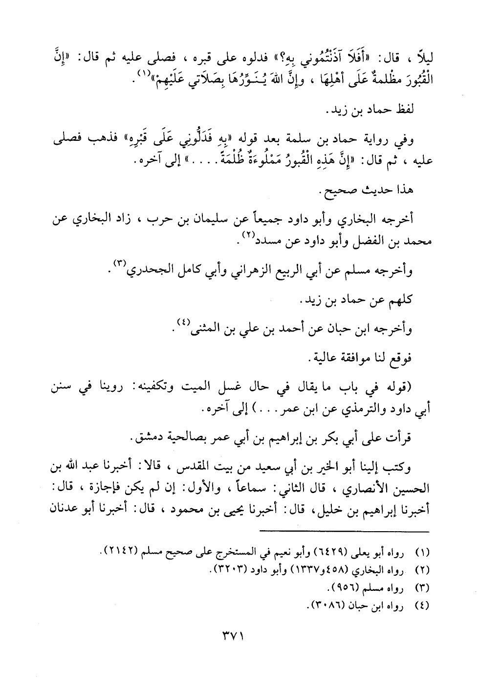 وفي رواية حماد بن سلمة بعد قوله ((به فدلوني على قبره)) فذهب فصلى عليه، ثم قال: ((إن هذه القبور مملوءةٌ ظلمةً ..)) إلى آخره.
