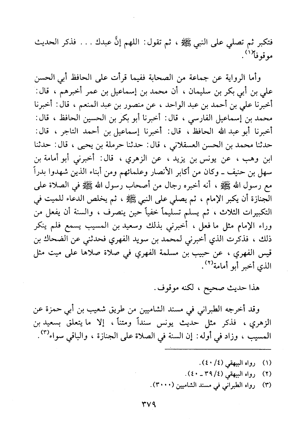 وأما الرواية عن جماعة من الصحابة ففيما قرأت على الحافظ أبي الحسن علي بن أبي بكر بن سليمان، أن محمد بن إسماعيل بن عمر أخبرهم، قال: أخبرنا علي بن أحمد بن عبد الواحد، عن منصور بن عبد المنعم، قال: أخبرنا محمد بن إسماعيل الفارسي، قال: أخبرنا أبو بكر بن الحسين الحافظ، قال: أخبرنا أبو عبد الله الحافظ، قال: أخبرنا إسماعيل بن أحمد التاجر، قال: حدثنا محمد بن الحسن العسقلاني، قال: حدثنا حرملة بن يحيى، قال: حدثنا ابن وهب، عن يونس بن يزيد، عن الزهري، قال: أخبرني أبو أمامة بن سهل بن حنيف -وكان من أكابر الأنصار وعلمائهم ومن أبناء الذين شهدوا بدراً مع رسول الله صلى الله عليه وسلم، أنه أخبره رجال من أصحاب رسول الله صلى الله عليه وسلم في الصلاة على الجنازة أن يكبر الإمام، ثم يصلي على النبي صلى الله عليه وسلم، ثم يخلص الدعاء للميت في التكبيرات الثلاث، ثم يسلم تسليماً خفياً حين ينصرف، والسنة أن يفعل من وراء الإمام مثل ما فعل، أخبرني بذلك وسعيد بن المسيب يسمع فلم ينكر ذلك، فذكرت الذي أخبرني لمحمد بن سويد الفهري فحدثني عن الضحاك بن قيس الفهري، عن حبيب بن مسلمة الفهري في صلاة صلاها على ميت مثل الذي أخبر أبو أمامة.