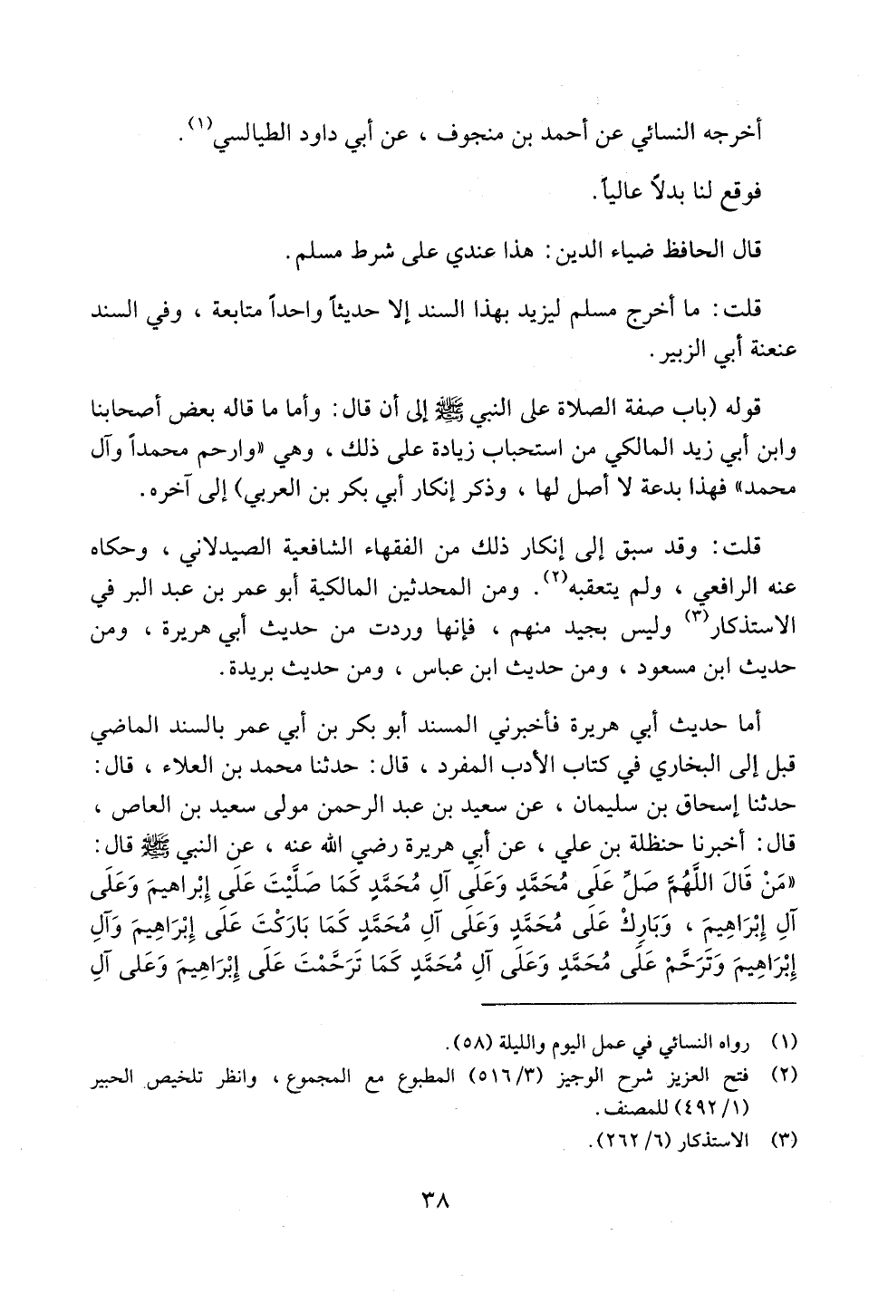 أما حديث أبي هريرة فأخبرني المسند أبو بكر بن أبي عمر بالسند الماضي قبل إلى البخاري في كتاب الأدب المفرد، قال: حدثنا محمد بن العلاء، قال: حدثنا إسحاق بن سليمان، عن سعيد بن عبد الرحمن مولى سعيد بن العاص، قال: أخبرنا حنظلة بن علي، عن أبي هريرة رضي الله عنه، عن النبي صلى الله عليه وسلم قال: ((من قال اللهم صل على محمدٍ وعلى آل محمدٍ كما صليت على إبراهيم وعلى آل إبراهيم، وبارك على محمد وعلى آل محمد كما باركت على إبراهيم وآل إبراهيم وترحم على محمدٍ وعلى آل محمدٍ كما ترحمت على إبراهيم وعلى آل