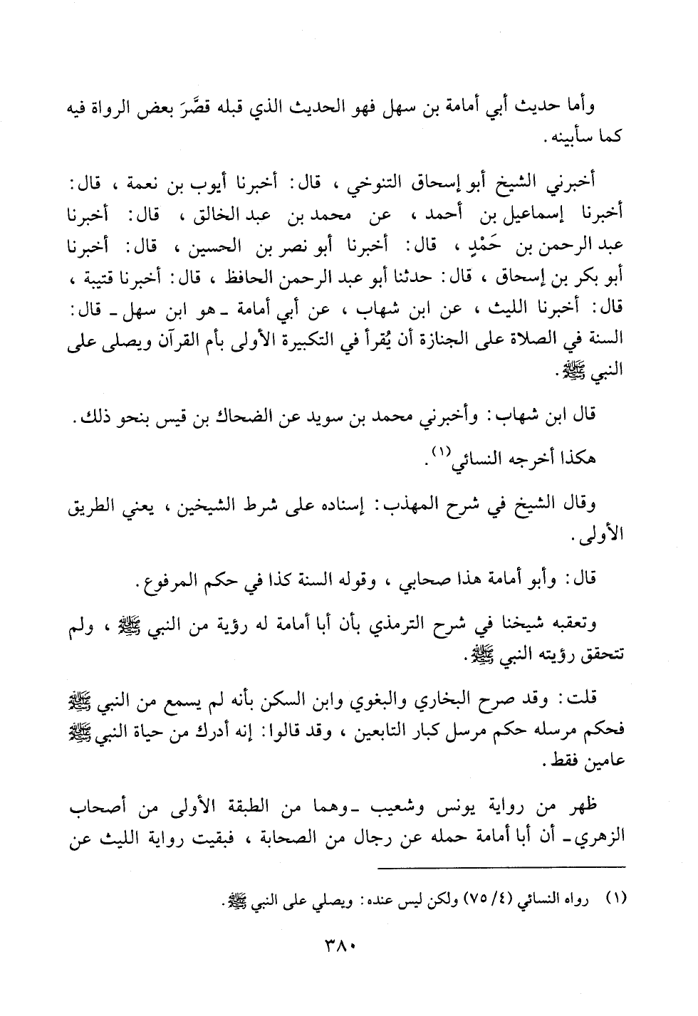 أخبرني الشيخ أبو إسحاق التنوخي، قال: أخبرنا أيوب بن نعمة، قال: أخبرنا إسماعيل بن أحمد، عن محمد بن عبد الخالق، قال: أخبرنا عبد الرحمن بن حمدٍ، قال: أخبرنا أبو نصر بن الحسين، قال: أخبرنا أبو بكر بن إسحاق، قال: حدثنا أبو عبد الرحمن الحافظ، قال: أخبرنا قتيبة، قال: أخبرنا الليث، عن ابن شهاب، عن أبي أمامة -هو ابن سهل- قال: السنة في الصلاة على الجنازة أن يقرأ في التكبيرة الأولى بأم القرآن ويصلى على النبي صلى الله عليه وسلم.