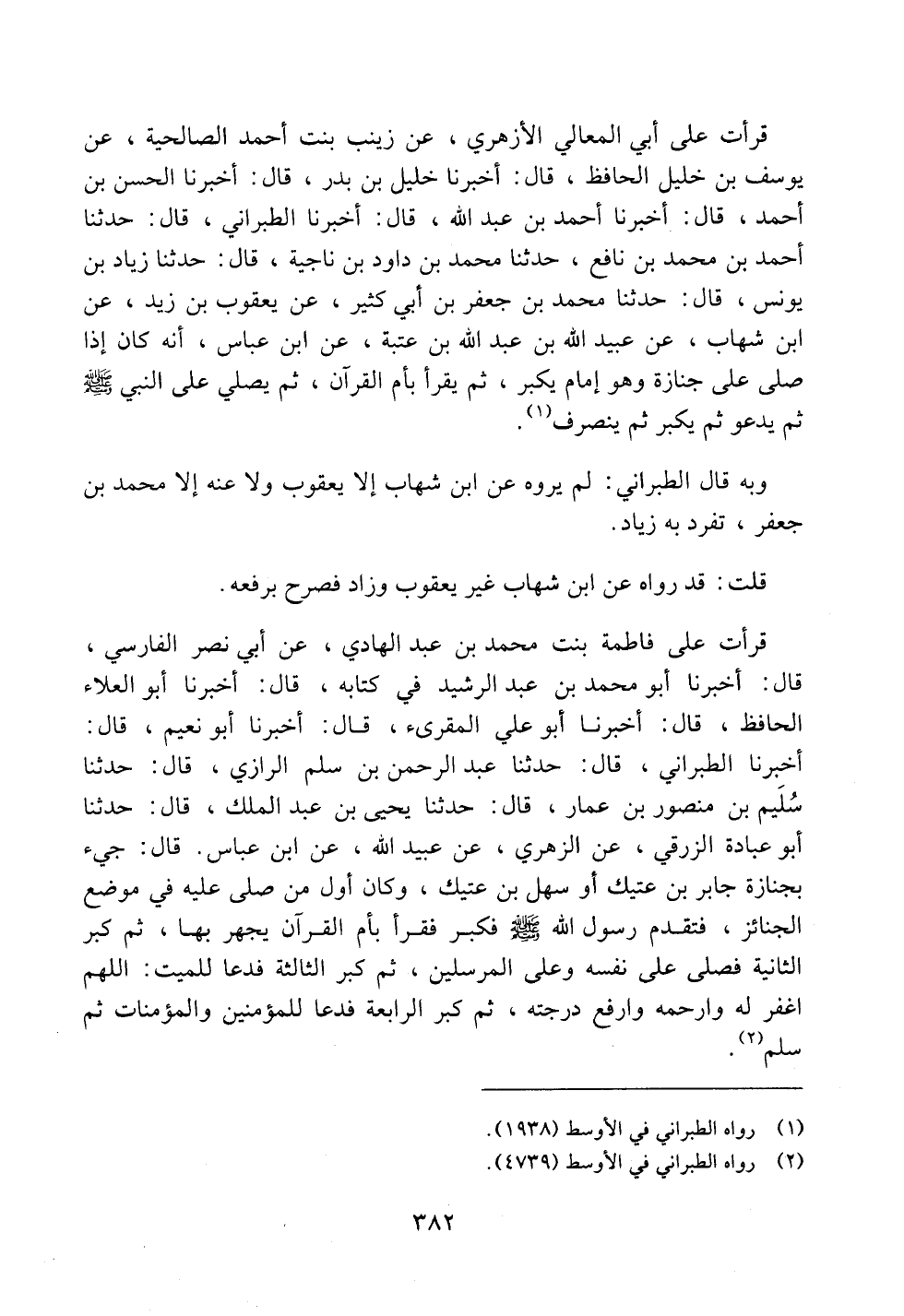 قرأت على أبي المعالي الأزهري، عن زينب بنت أحمد الصالحية، عن يوسف بن خليل الحافظ، قال: أخبرنا خليل بن بدر، قال: أخبرنا الحسن بن أحمد، قال: أخبرنا أحمد بن عبد الله، قال: أخبرنا الطبراني، قال: حدثنا أحمد بن محمد بن نافع، حدثنا محمد بن داود بن ناجية، قال: حدثنا زياد بن يونس، قال حدثنا محمد بن جعفر بن أبي كثير، عن يعقوب بن زيد، عن ابن شهاب، عن عبيد الله بن عبد الله بن عتبة، عن ابن عباس، أنه كان إذا صلى على جنازة وهو إمام يكبر، ثم يقرأ بأم القرآن، ثم يصلي على النبي صلى الله عليه وسلم ثم يدعو ثم يكبر ثم ينصرف.