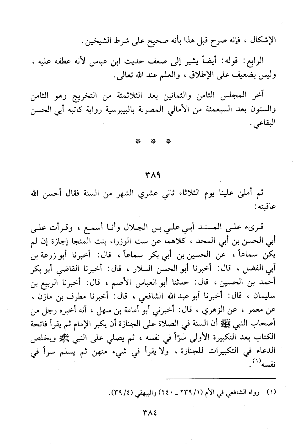 قرئ على المسند أبي علي بن الجلال وأنا أسمع، وقرأت على أبي الحسن بن أبي المجد، كلاهما عن ست الوزراء بنت المنجا إجازة إن لم يكن سماعاً، عن الحسين بن أبي بكر سماعاً، قال: أخبرنا أبو زرعة بن أبي الفضل، قال: أخبرنا أبو الحسن السلار، قال: أخبرنا القاضي أبو بكر أحمد بن الحسين، قال: حدثنا أبو العباس الأصم، قال: أخبرنا الربيع بن سليمان، قال: أخبرنا أبو عبد الله الشافعي، قال: أخبرنا مطرف بن مازن، عن معمر، عن الزهري، قال: أخبرني أبو أمامة بن سهل، أنه أخبره رجل من أصحاب النبي صلى الله عليه وسلم أن السنة في الصلاة على الجنازة أن يكبر الإمام ثم يقرأ فاتحة الكتاب بعد التكبيرة الأولى سراً في نفسه، ثم يصلي على النبي صلى الله عليه وسلم ويخلص الدعاء في التكبيرات للجنازة، ولا يقرأ في شيء منهن ثم يسلم سراً في نفسه.