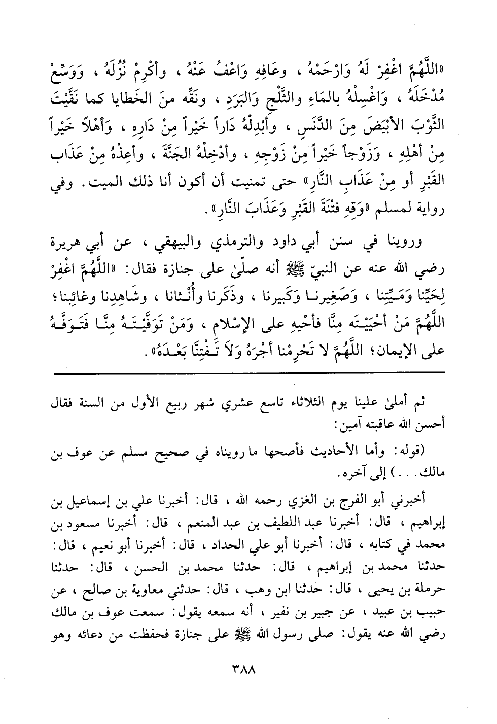 أخبرني أبو الفرج بن الغزي رحمه الله، قال: أخبرنا علي بن إسماعيل بن إبراهيم، قال: أخبرنا عبد اللطيف بن عبد المنعم، قال: أخبرنا مسعود بن محمد في كتابه، قال: أخبرنا أبو علي الحداد، قال: أخبرنا أبو نعيم، قال: حدثنا محمد بن إبراهيم، قال: حدثنا محمد بن الحسن، قال: حدثنا حرملة بن يحيى، قال: حدثنا ابن وهب، قال: حدثني معاوية بن صالح، عن حبيب بن عبيد، عن جبير بن نفير، أنه سمعه يقول: سمعت عوف بن مالك رضي الله عنه يقول: صلى رسول الله صلى الله عليه وسلم على جنازة فحفظت من دعائه وهو