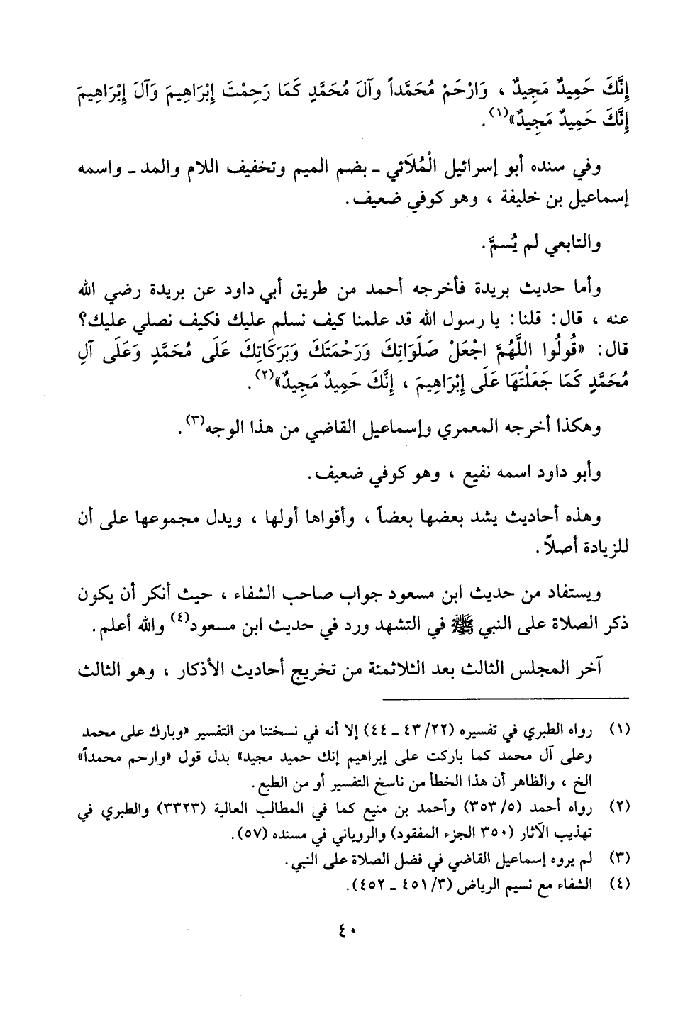 ويستفاد من حديث ابن مسعود جواب صاحب الشفاء، حيث أنكر أن يكون ذكر الصلاة على النبي صلى الله عليه وسلم في التشهد ورد في حديث ابن مسعود والله أعلم.