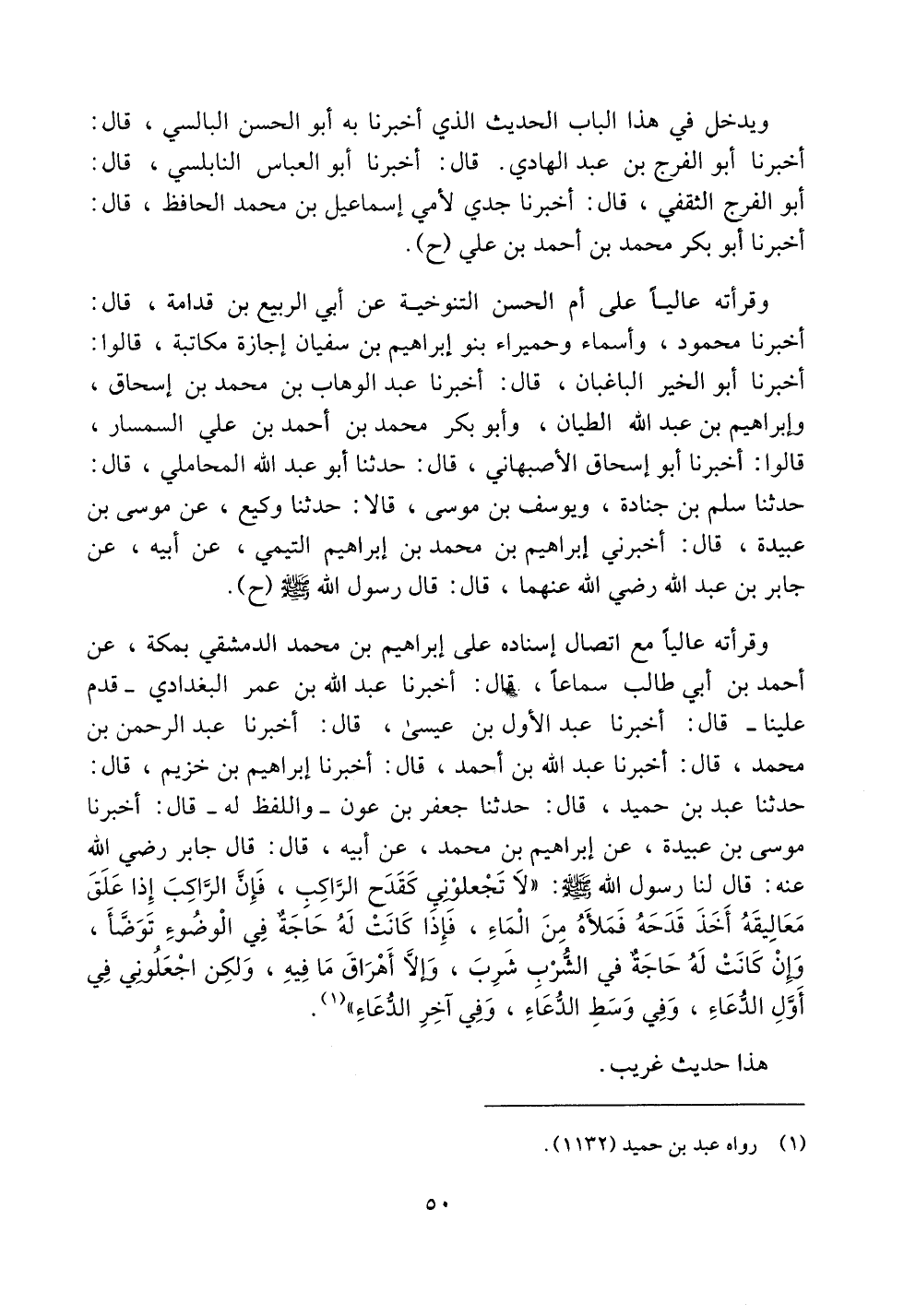 وقرأته عالياً مع اتصال إسناده على إبراهيم بن محمد الدمشقي بمكة، عن أحمد بن أبي طالب سماعاً، قال: أخبرنا عبد الله بن عمر البغدادي -قدم علينا- قال: أخبرنا عبد الأول بن عيسى، قال: أخبرنا عبد الرحمن بن محمد، قال: أخبرنا عبد الله بن أحمد، قال: أخبرنا إبراهيم بن خزيم، قال: حدثنا عبد بن حميد، قال: حدثنا جعفر بن عون -واللفظ له- قال: أخبرنا موسى بن عبيدة، عن إبراهيم بن محمد، عن أبيه، قال: قال جابر رضي الله عنه: قال لنا رسول الله صلى الله عليه وسلم: ((لا تجعلوني كقدح الراكب، فإن الراكب إذا علق معاليقه أخذ قدحه فملأه من الماء، فإذا كانت له حاجة في الوضوء توضأ، وإن كانت له حاجةٌ في الشرب شرب، وإلا أهراق ما فيه، ولكن اجعلوني في أول الدعاء، وفي وسط الدعاء، وفي آخر الدعاء)).