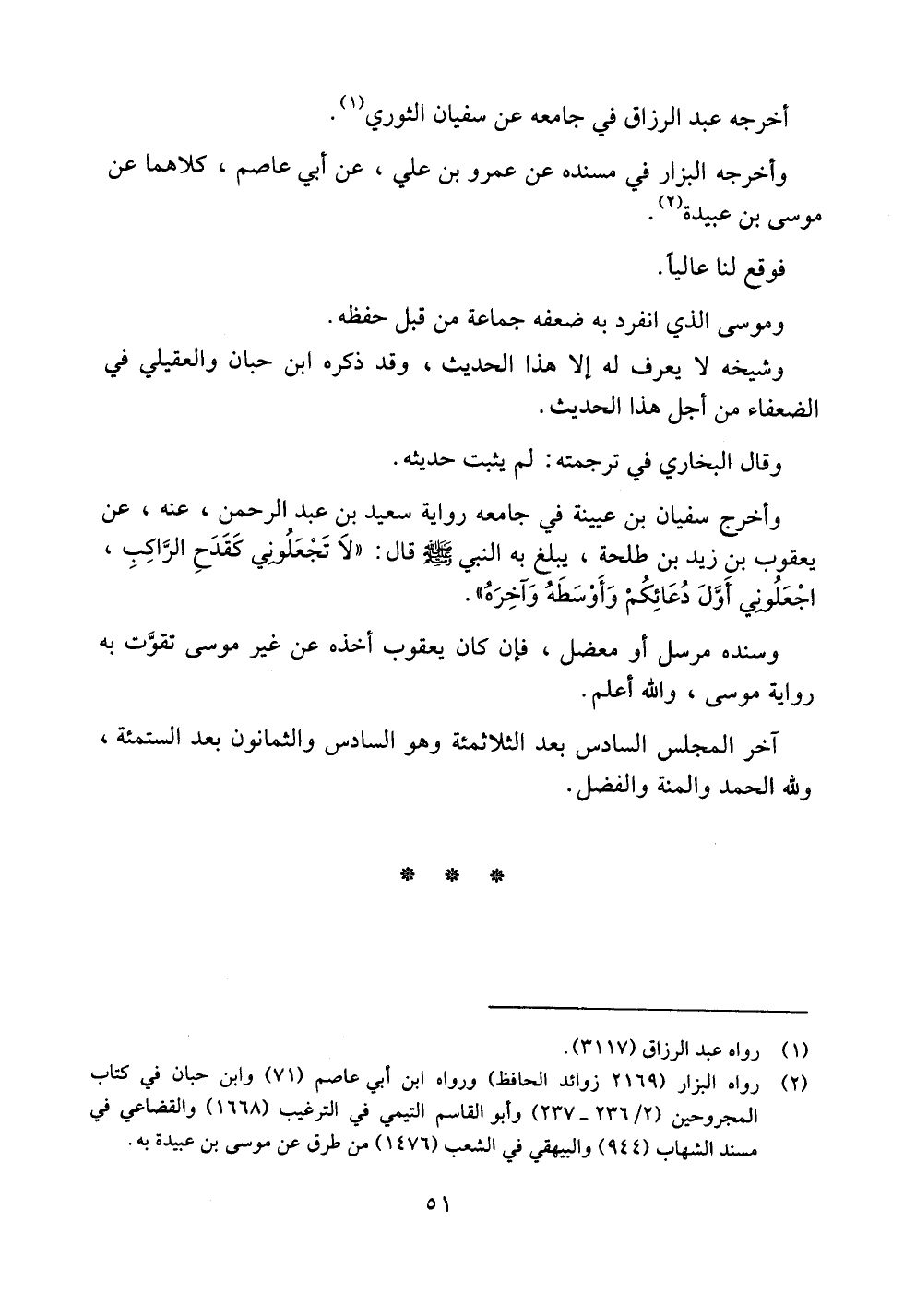 وأخرج سفيان بن عيينة في جامعه رواية سعيد بن عبد الرحمن، عنه، عن يعقوب بن زيد بن طلحة، يبلغ به النبي صلى الله عليه وسلم قال: ((لا تجعلوني كقدح الراكب، اجعلوني أول دعائكم وأوسطه وآخره)).