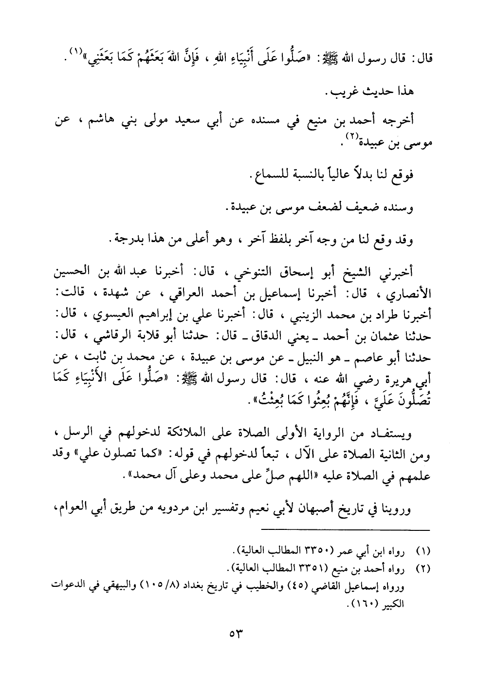أخبرني الشيخ أبو إسحاق التنوخي، قال: أخبرنا عبد الله بن الحسين الأنصاري، قال: أخبرنا إسماعيل بن أحمد العراقي، عن شهدة، قالت: أخبرنا طراد بن محمد الزينبي، قال: أخبرنا علي بن إبراهيم العيسوي، قال: حدثنا عثمان بن أحمد -يعني الدقاق- قال: حدثنا أبو قلابة الرقاشي، قال: حدثنا أبو عاصم -هو النبيل- عن موسى بن عبيدة، عن محمد بن ثابت، عن أبي هريرة رضي الله عنه، قال: قال رسول الله صلى الله عليه وسلم: ((صلوا على الأنبياء كما تصلون علي، فإنهم بعثوا كما بعثت)).