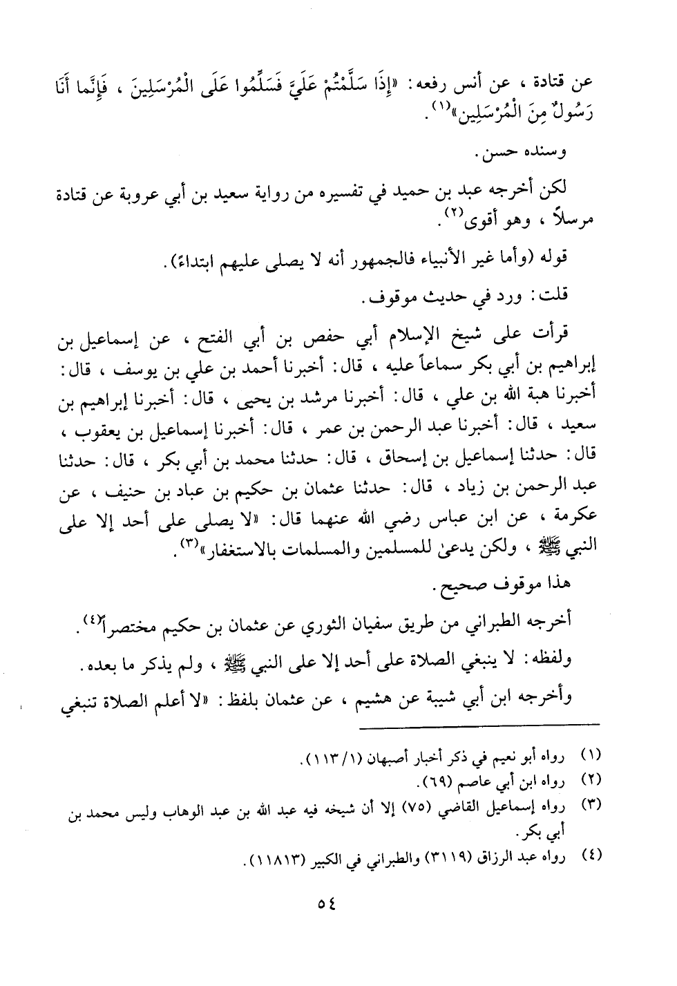 قرأت على شيخ الإسلام أبي حفص بن أبي الفتح، عن إسماعيل بن إبراهيم بن أبي بكر سماعاً عليه، قال: أخبرنا أحمد بن علي بن يوسف، قال: أخبرنا هبة الله بن علي، قال: أخبرنا مرشد بن يحيى، قال: أخبرنا إبراهيم بن سعيد، قال: أخبرنا عبد الرحمن بن عمر، قال: أخبرنا إسماعيل بن يعقوب، قال: حدثنا إسماعيل بن إسحاق، قال: حدثنا محمد بن أبي بكر، قال: حدثنا عبد الرحمن بن زياد، قال: حدثنا عثمان بن حكيم بن عباد بن حنيف، عن عكرمة، عن ابن عباس رضي الله عنهما قال: ((لا يصلى على أحد إلا على النبي صلى الله عليه وسلم، ولكن يدعى للمسلمين والمسلمات بالاستغفار)).