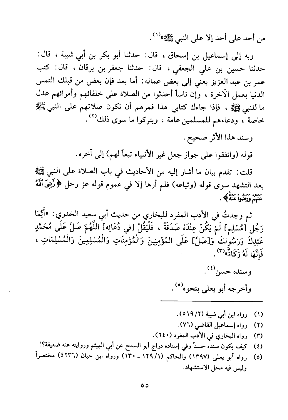 وبه إلى إسماعيل بن إسحاق، قال: حدثنا أبو بكر بن أبي شيبة، قال: حدثنا حسين بن علي الجعفي، قال: حدثنا جعفر بن برقان، قال: كتب عمر بن عبد العزيز يعني إلى بعض عماله: أما بعد فإن بعض من قبلك التمس الدنيا بعمل الآخرة، وإن ناساً أحدثوا من الصلاة على خلفائهم وأمرائهم عدل ما للنبي صلى الله عليه وسلم، فإذا جاءك كتابي هذا فمرهم أن تكون صلاتهم على النبي صلى الله عليه وسلم خاصة، ودعاءهم للمسلمين عامة، ويتركوا ما سوى ذلك.