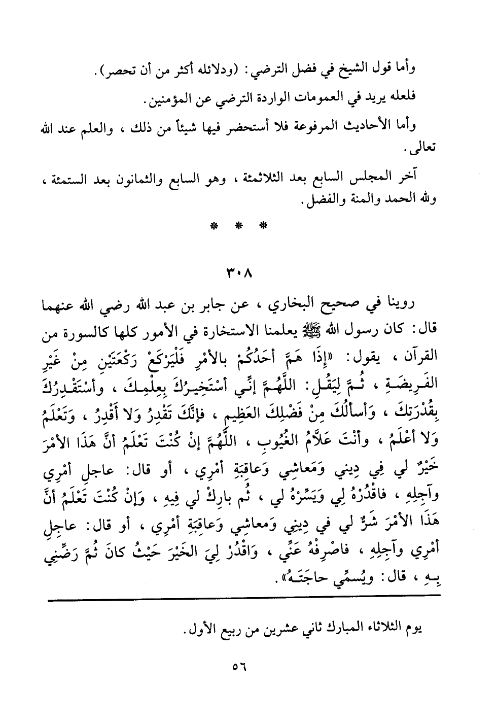 [[روينا في صحيح البخاري، عن جابر بن عبد الله رضي الله عنهما قال: كان رسول الله صلى الله عليه وسلم يعلمنا الاستخارة في الأمور كلها كالسورة من القرآن، يقول: ((إذا هم أحدكم بالأمر فليركع ركعتين من غير الفريضة، ثم ليقل: اللهم إني أستخيرك بعلمك، وأستقدرك بقدرتك، وأسألك من فضلك العظيم، فإنك تقدر ولا أقدر، وتعلم ولا أعلم، وأنت علام بالغيوب، اللهم إن كنت تعلم أن هذا الأمر خيرٌ لي في ديني ومعاشي وعاقبة أمري، أو قال: عاجل أمري وآجله، فاقدره لي ويسره لي، ثم بارك لي فيه، وإن كنت تعلم أن هذا الأمر شرٌّ لي في ديني ومعاشي وعاقبة أمري، أو قال: عاجل أمري وآجله، فاصرفه عني، واقدر لي الخير حيث كان ثم رضني به، قال: ويسمي حاجته)).]]