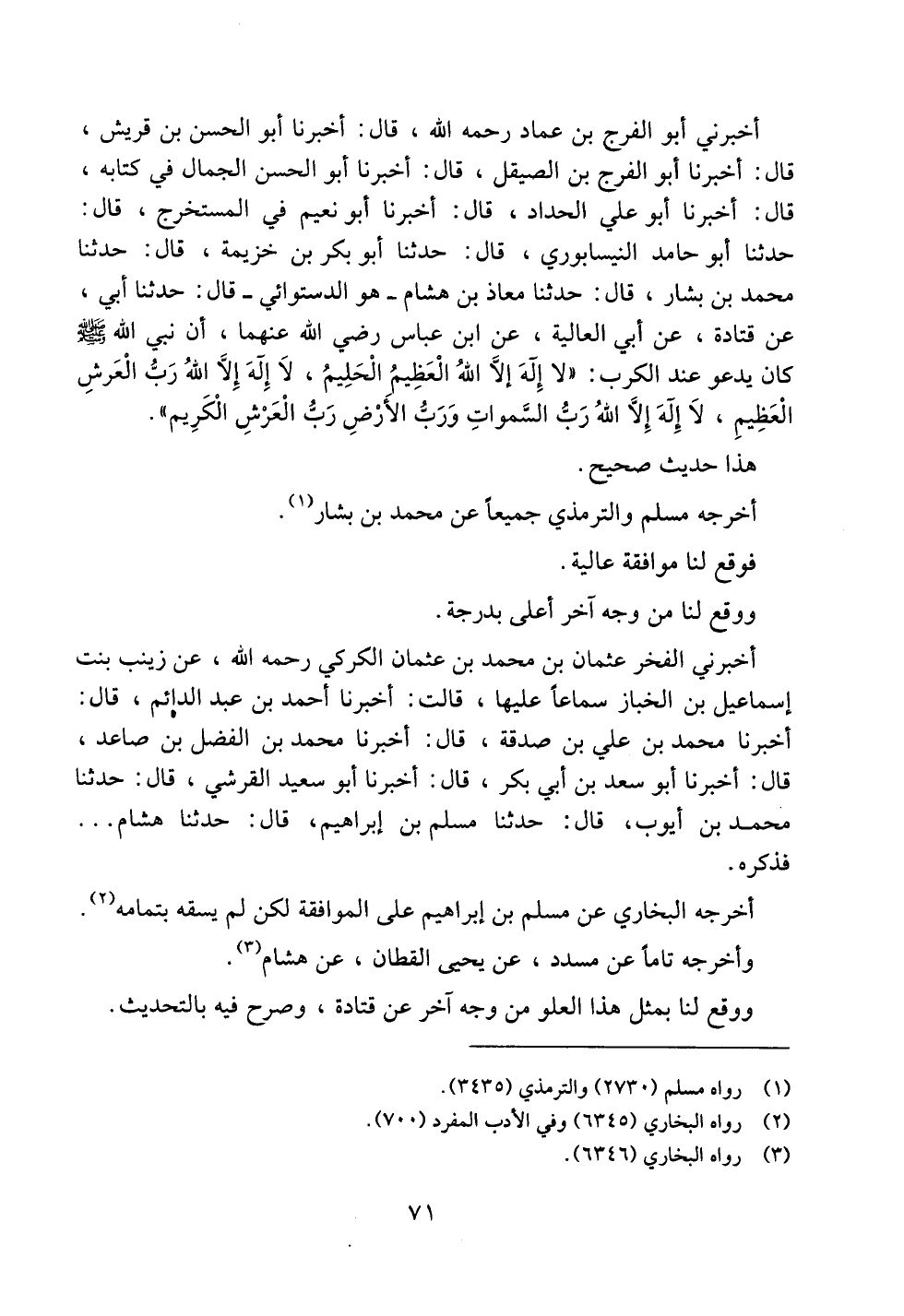 أخبرني أبو الفرج بن عماد رحمه الله، قال: أخبرنا أبو الحسن بن قريش، قال: أخبرنا أبو الفرج بن الصيقل، قال: أخبرنا أبو الحسن الجمال في كتابه، قال: أخبرنا أبو علي الحداد، قال: أخبرنا أبو نعيم في المستخرج، قال: حدثنا أبو حامد النيسابوري، قال: حدثنا أبو بكر بن خزيمة، قال: حدثنا محمد بن بشار، قال: حدثنا معاذ بن هشام -هو الدستوائي- قال: حدثنا أبي، عن قتادة، عن أبي العالية، عن ابن عباس رضي الله عنهما، أن نبي الله صلى الله عليه وسلم كان يدعو عند الكرب: ((لا إله إلا الله العظيم الحليم، لا إله إلا الله رب العرش العظيم، لا إله إلا رب السموات ورب الأرض رب العرش الكريم)).