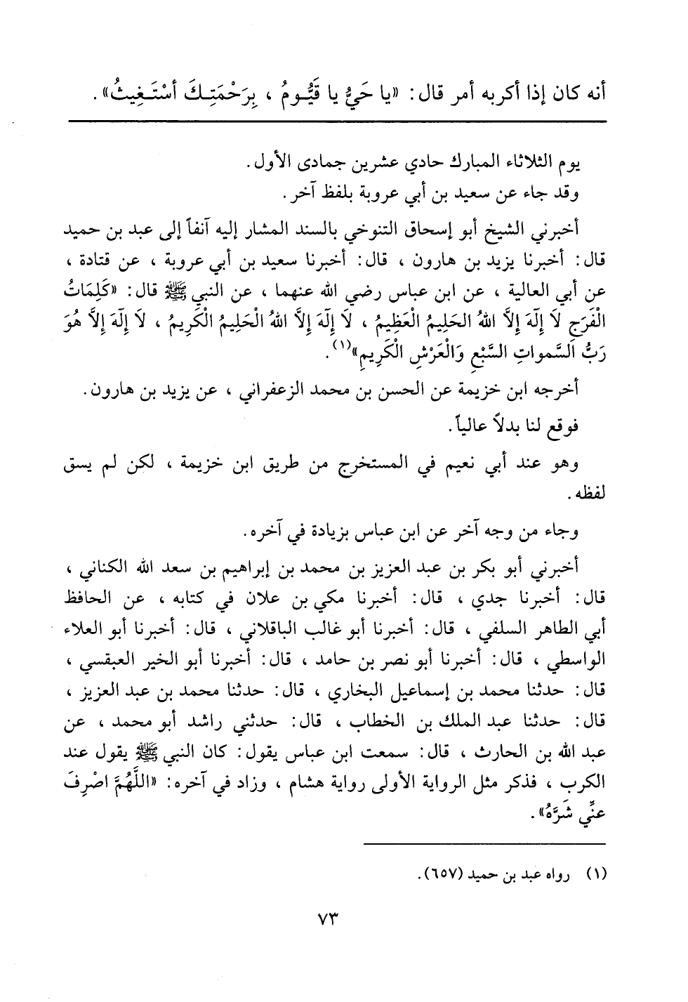 أخبرني الشيخ أبو إسحاق التنوخي بالسند المشار إليه آنفاً إلى عبد بن حميد قال: أخبرنا يزيد بن هارون، قال: أخبرنا سعيد بن أبي عروبة، عن قتادة، عن أبي العالية، عن ابن عباس رضي الله عنهما، عن النبي صلى الله عليه وسلم قال: ((كلمات الفرج لا إله إلا الله الحليم العظيم، لا إله إلا الله الحليم الكريم، لا إله إلا هو رب السموات السبع والعرش الكريم)).