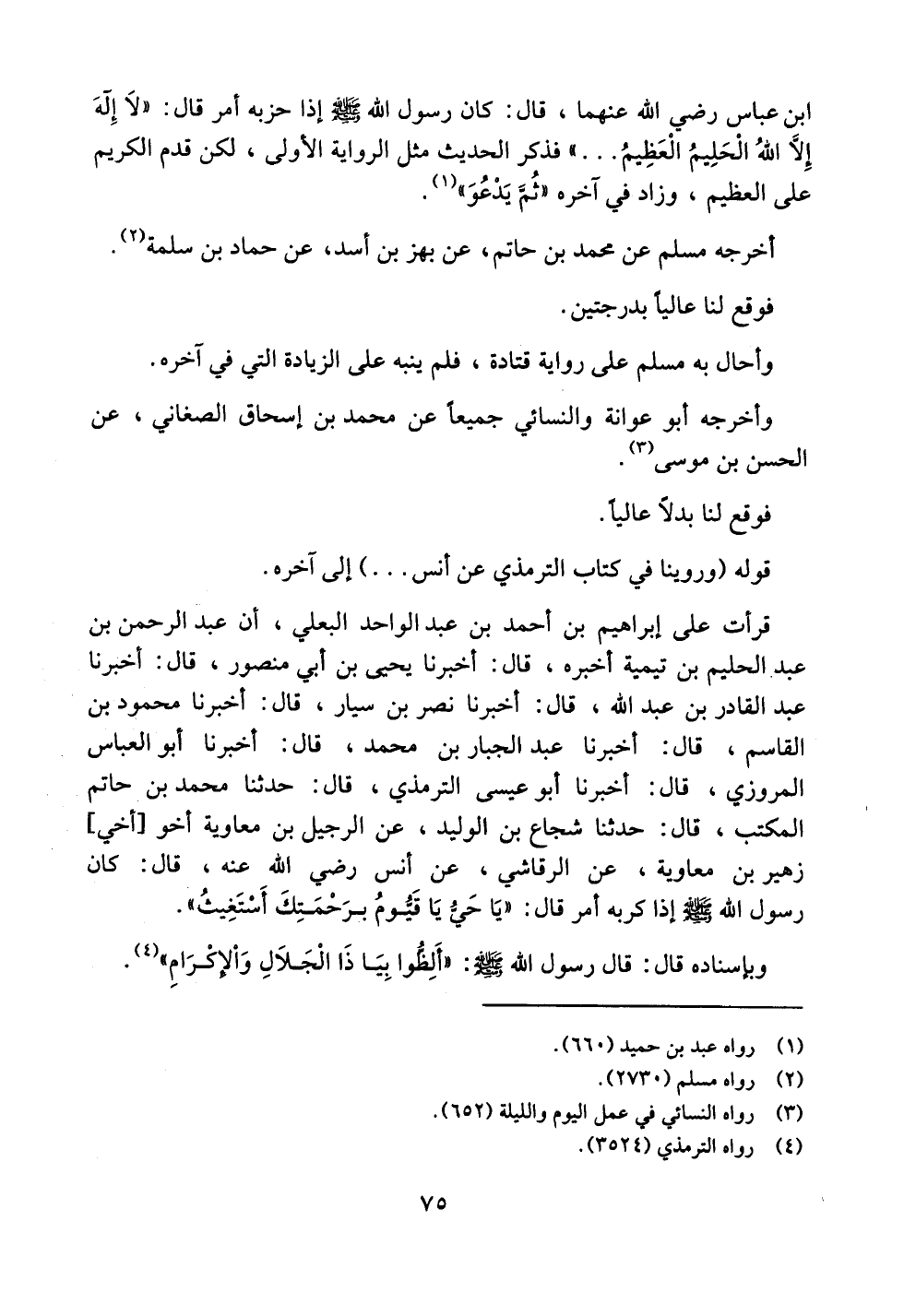 قرأت على إبراهيم بن أحمد بن عبد الواحد البعلي، أن عبد الرحمن بن عبد الحليم بن تيمية أخبره، قال: أخبرنا يحيى بن أبي منصور، قال: أخبرنا عبد القادر بن عبد الله، قال: أخبرنا نصر بن سيار، قال: أخبرنا محمود بن القاسم، قال: أخبرنا عبد الجبار بن محمد، قال: أخبرنا أبو العباس المروزي، قال: أخبرنا أبو عيسى الترمذي، قال: حدثنا محمد بن حاتم المكتب، قال: حدثنا شجاع بن الوليد، عن الرجيل بن معاوية أخو[ أخي] زهير بن معاوية، عن الرقاشي، عن أنس رضي الله عنه، قال: كان رسول الله صلى الله عليه وسلم إذا كربه أمر قال: ((يا حي يا قيوم برحمتك أستغيث)).