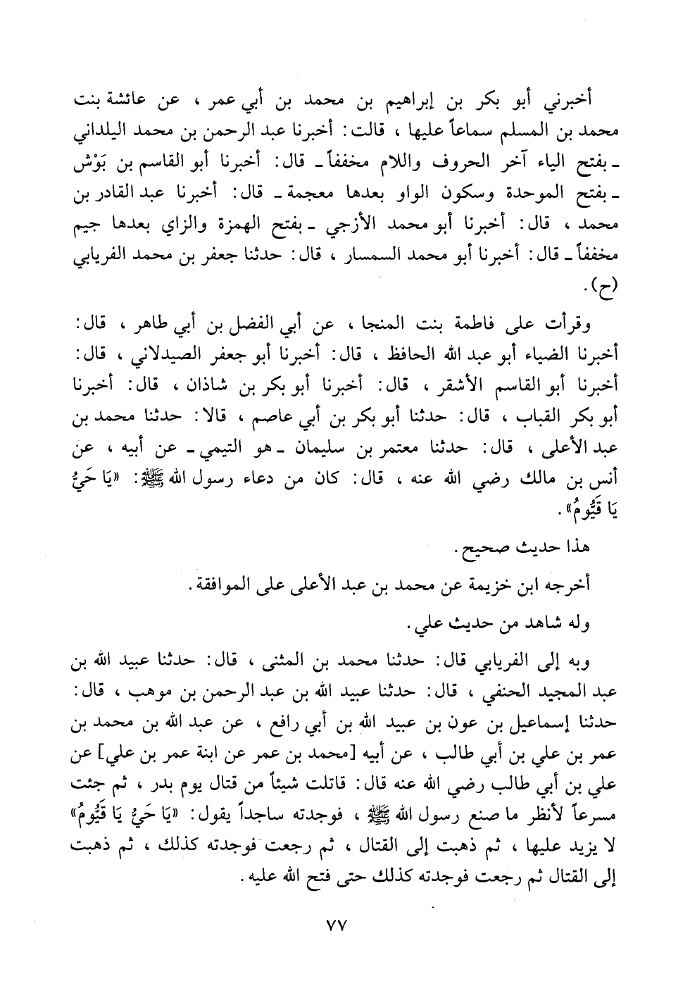 وبه إلى الفريابي قال: حدثنا محمد بن المثنى، قال: حدثنا عبيد الله بن عبد المجيد الحنفي، قال: حدثنا عبيد الله بن عبد الرحمن بن موهب، قال: حدثنا إسماعيل بن عون بن عبيد الله بن أبي رافع، عن عبد الله بن محمد بن عمر بن علي بن أبي طالب، عن أبيه [محمد بن عمر عن ابنة عمر بن علي] عن علي بن أبي طالب رضي الله عنه قال: قاتلت شيئاً من قتال يوم بدر، ثم جئت مسرعاً لأنظر ما صنع رسول الله صلى الله عليه وسلم، فوجدته ساجداً يقول: ((يا حي يا قيوم)) لا يزيد عليها، ثم ذهبت إلى القتال، ثم رجعت فوجدته كذلك، ثم ذهبت إلى القتال ثم رجعت فوجدته كذلك حتى فتح الله عليه.