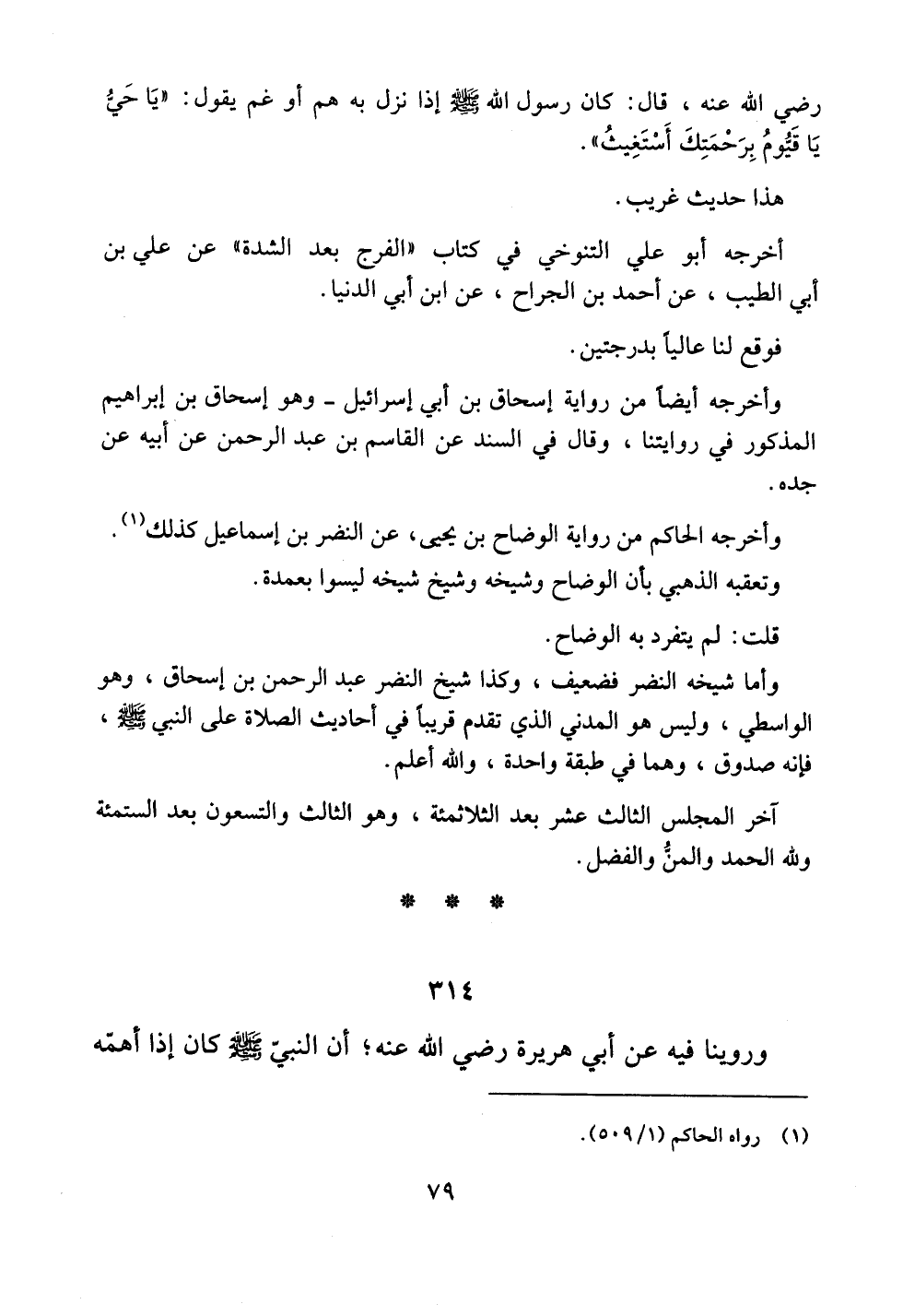 رضي الله عنه، قال: كان رسول الله صلى الله عليه وسلم إذا نزل به هم أو غم يقول: ((يا حي يا قيوم برحمتك أستغيث)).