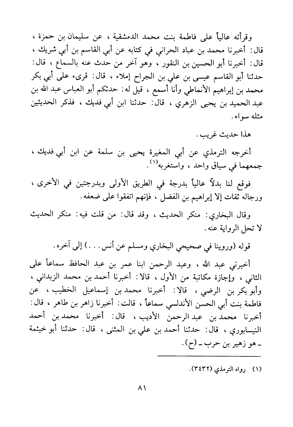 أخبرني عبد الله، وعبد الرحمن ابنا عمر بن عبد الحافظ سماعاً على الثاني، وإجازة مكاتبة، من الأول، قالا: أخبرنا أحمد بن محمد الزبداني، وأبو بكر بن الرضي، قالا: أخبرنا محمد بن إسماعيل الخطيب، عن فاطمة بنت أبي الحسن الأندلسي سماعاً، قالت: أخبرنا زاهر بن طاهر، قال: أخبرنا محمد بن عبد الرحمن الأديب، قال: أخبرنا محمد بن أحمد النيسابوري، قال: حدثنا أحمد بن علي بن المثنى، قال: حدثنا أبو خيثمة -هو زهير بن حرب- (ح).