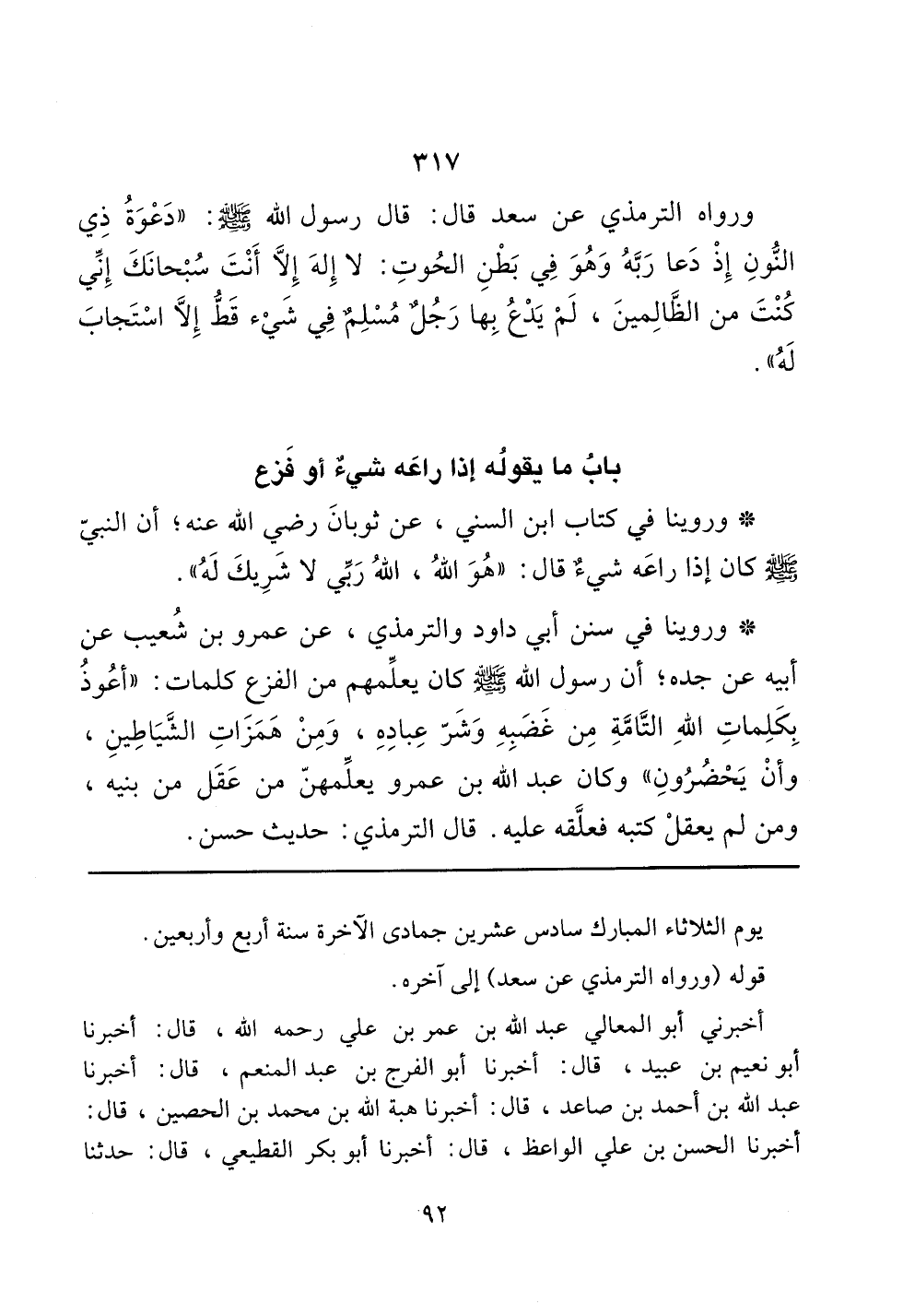 [[ورواه الترمذي عن سعد قال: قال رسول الله صلى الله عليه وسلم: ((دعوة ذي النون إذ دعا ربه وهو في بطن الحوت: لا إله إلا أنت سبحانك إني كنت من الظالمين، لم يدع بها رجلٌ مسلمٌ في شيء قط إلا استجاب له)).