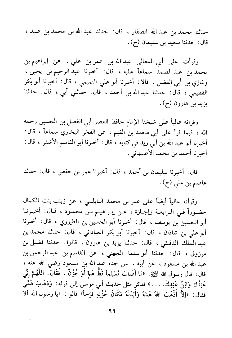 وقرأته عالياً أيضاً على عمر بن محمد النابلسي، عن زينب بنت الكمال حضوراً في الرابعة وإجازة، عن إبراهيم بن محمود، قال: أخبرنا أبو الحسين بن يوسف، قال: أخبرنا أبو الحسين بن الطيوري، قال: أخبرنا أبو علي بن شاذان، قال: أخبرنا أبو بكر العباداني، قال: حدثنا محمد بن عبد الملك الدقيقي، قال: حدثنا يزيد بن هارون، قالوا: حدثنا فضيل بن مرزوق، قال: حدثنا أبو سلمة الجهني، عن القاسم بن عبد الرحمن بن عبد الله بن مسعود، عن أبيه، عن جده عبد الله بن مسعود رضي الله عنه، قال: قال رسول الله صلى الله عليه وسلم: ((ما أصاب مسلماً قط هم أو حزنٌ، فقال: اللهم إني عبدك وابن عبدك ..)) فذكر مثل حديث أبي موسى إلى قوله: وذهاب همي فقال: ((إلا أذهب الله همه وأبدله مكان حزنه فرحاً)) قالوا: ((يا رسول الله ألا