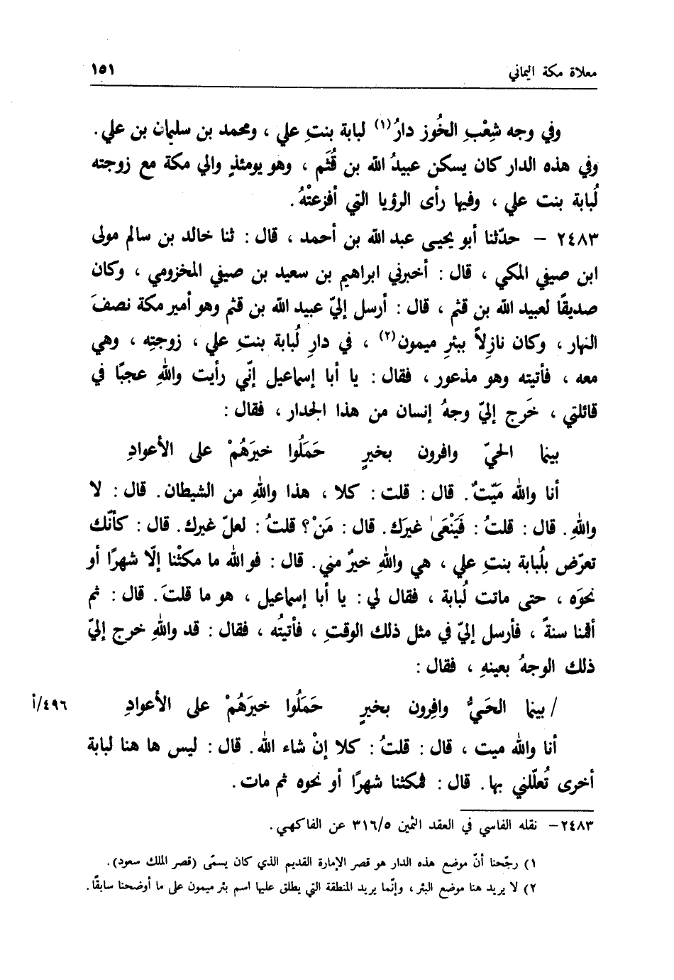 2505 - حَدَّثَنِي أَبُو يَحْيَى بْنُ أَبِي مَسَرَّةَ قَالَ: حَدَّثَنِي مُحَمَّدُ بْنُ مُحَمَّدٍ الْمَخْزُومِيُّ أَبُو عُبَيْدَةَ قَالَ: ثنا زَكَرِيَّا بْنُ مَطَرٍ، عَنْ صَفِيَّةَ بِنْتِ زُهَيْرِ بْنِ قُنْفُذٍ الْأَسَدِيَّةِ، عَنْ أَبِيهَا، رَضِيَ اللهُ عَنْهُ قَالَ: إِنَّ النَّبِيَّ صَلَّى اللَّهُ عَلَيْهِ وَسَلَّمَ كَانَ §يَكُونُ فِي حِرَاءٍ بِالنَّهَارِ فَإِذَا كَانَ اللَّيْلُ نَزَلَ مِنْ حِرَاءٍ فَأَتَى الْمَسْجِدَ الَّذِي فِي الشِّعْبِ الَّذِي خَلْفَ دَارِ أَبِي عُبَيْدَةَ يُعْرَفُ بِالْخَلِفِيِّينَ وَتَأْتِيهِ خَدِيجَةُ رَضِيَ اللهُ عَنْهَا مِنْ مَكَّةَ فَيَلْتَقِيَانِ فِي الْمَسْجِدِ الَّذِي فِي الشِّعْبِ فَإِذَا قَرُبَ الصَّبَّاحُ افْتَرَقَا أَوْ نَحْوَهُ "