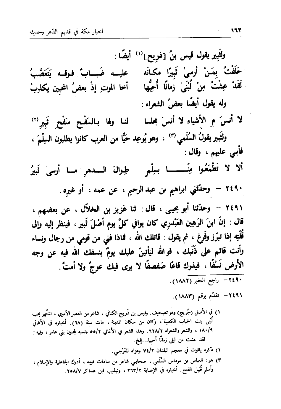 2508 - حَدَّثَنَا ابْنُ أَبِي مَسَرَّةَ أَبُو يَحْيَى قَالَ: ثنا خَالِدُ بْنُ سَالِمٍ، مَوْلَى ابْنِ صَيْفِيٍّ قَالَ: §كُنَّا فِي نُزْهَةٍ لَنَا بِشِعْبِ آلِ عَبْدِ اللهِ فَخَرَجْنَا نَتَمَشَّى بِهِ فَإِذَا سَعِيدُ بْنُ سَالِمٍ الْقَدَّاحُ وَهُوَ يَوْمَئِذٍ فَقِيهُ أَهْلِ مَكَّةَ فِي إِزَارٍ قَدْ أَقْبَلَ مِنْ نَاحِيَةِ ثُرَيْرٍ وَمَعَهُ جَرِيدَةٌ فِيهَا ثَوْبٌ قَدْ جَعَلَهُ مِثْلَ الْبَنْدِ وَهُوَ يَقُولُ: لَا حُكْمَ إِلَّا لِلَّهِ قَالَ: فَقُلْنَا لَهُ: مَا هَذَا يَا أَبَا عُثْمَانَ؟ قَالَ: كُنَّا فِي نُزْهَةٍ لَنَا فَبِعْنَا الْإِمَارَةَ مِنْ فُلَانٍ فَجَارَ عَلَيْنَا فَخَرَجْنَا لَهُ "