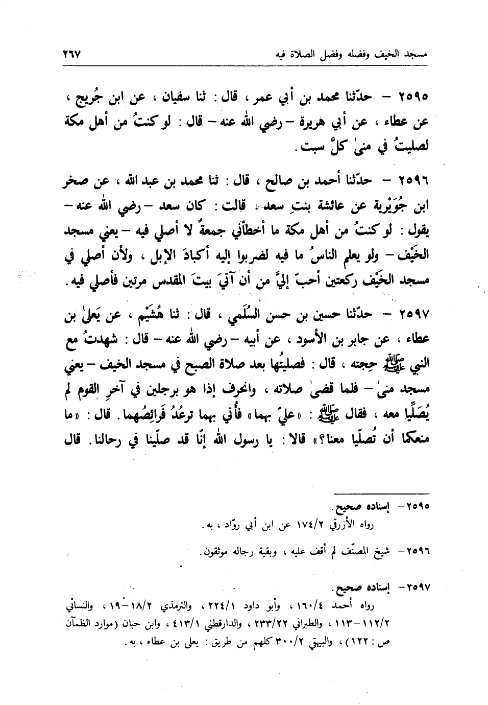 2646 - حَدَّثَنَا سَعِيدُ بْنُ عَبْدِ الرَّحْمَنِ قَالَ: ثنا عَبْدُ الْمَجِيدِ بْنُ أَبِي رَوَّادٍ، عَنِ ابْنِ جُرَيْجٍ قَالَ: سَأَلْتُ عَطَاءً عَنِ §الرُّكُوبِ، إِلَى الْجِمَارِ حَتَّى يَأْتِيَهَا لِلرَّمْيِ؟ فَقَالَ: مَا أُحِبُّهُ، وَمَا كُنْتُ لِآمُرَ بِهِ إِلَّا مِنْ وَجَعٍ أَوِ امْرَأَةٍ ثَقِيلَةٍ لَا تَسْتَطِيعُ أَنْ تَمْشِيَ إِلَيْهَا، قُلْتُ: أَفَرَأَيْتَ إِذَا فَرَغْتُ مِنْهَا أَرْجِعُ رَاكِبًا؟ قَالَ: فَرَغْتَ حِينَئِذٍ، فَارْكَبْ إِنْ شِئْتَ، قُلْتُ لِعَطَاءٍ: كَيْفَ بَلَغَكَ أَنَّ النَّبِيَّ صَلَّى اللَّهُ عَلَيْهِ وَسَلَّمَ كَانَ يَصْنَعُ فِي ذَلِكَ؟ قَالَ: بَلَغَنَا أَنَّهُ كَانَ يَمْشِي إِلَيْهَا قَالَ: قُلْتُ لَهُ: أَمَشَى إِذَا رَجَعَ أَمْ رَكِبَ؟ قَالَ: لَا أَدْرِي قَالَ: لَا أَظُنُّهُ إِلَّا كَانَ يَنْقَلِبُ مَاشِيًا قَالَ عَطَاءٌ: أَدْرَكْتُ النَّاسَ يَمْشُونَ إِلَى الرَّمْيِ مُقْبِلِينَ وَمُدْبِرِينَ