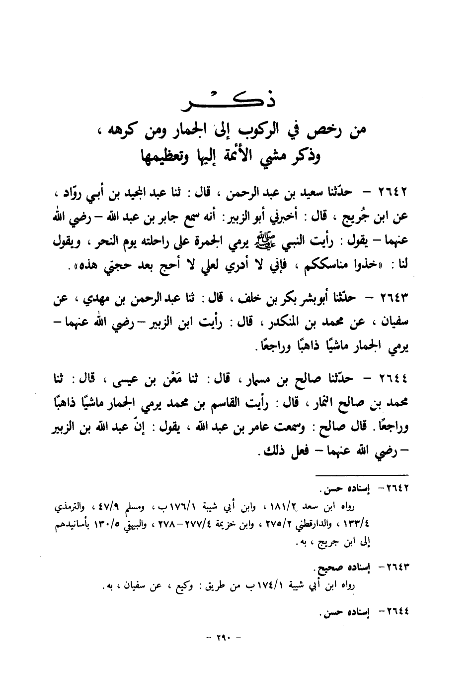 2682 - حَدَّثَنَا يَحْيَى بْنُ جَعْفَرِ بْنِ أَبِي طَالِبٍ قَالَ: ثنا عَلِيُّ بْنُ عَاصِمٍ قَالَ: ثنا أَبُو الْأَزْهَرِ قَالَ: رَأَيْتُ ابْنَ عُمَرَ رَضِيَ اللهُ عَنْهُمَا §يُلَبِّي بِمَكَّةَ حَتَّى إِنْ كَادَ لَيَسْمَعُ مَا بَيْنَ الْجَبَلَيْنِ يَعْنِي الْمَأْزِمَيْنِ مِنْ مِنًى إِنْ شَاءَ -[311]- اللهُ " وَذَرْعُ طَرِيقِ الْعَقَبَةِ مِنَ الْعَلَمِ الَّذِي عَلَى الْجِدَارِ إِلَى الْعَلَمِ الْآخَرِ الَّذِي يَحُدَّهُ تِسْعَةٌ وَسِتُّونَ ذِرَاعًا، وَالطَّرِيقُ مَفْرُوشَةٌ بِحِجَارَةٍ يَمُرُّ عَلَيْهَا سَيْلُ مِنًى. وَذَرْعُ الطَّرِيقِ الْأَعْظَمِ طَرِيقِ الْعَقَبَةِ الْخَارِجَةِ سِتَّةٌ وَثَلَاثُونَ ذِرَاعًا