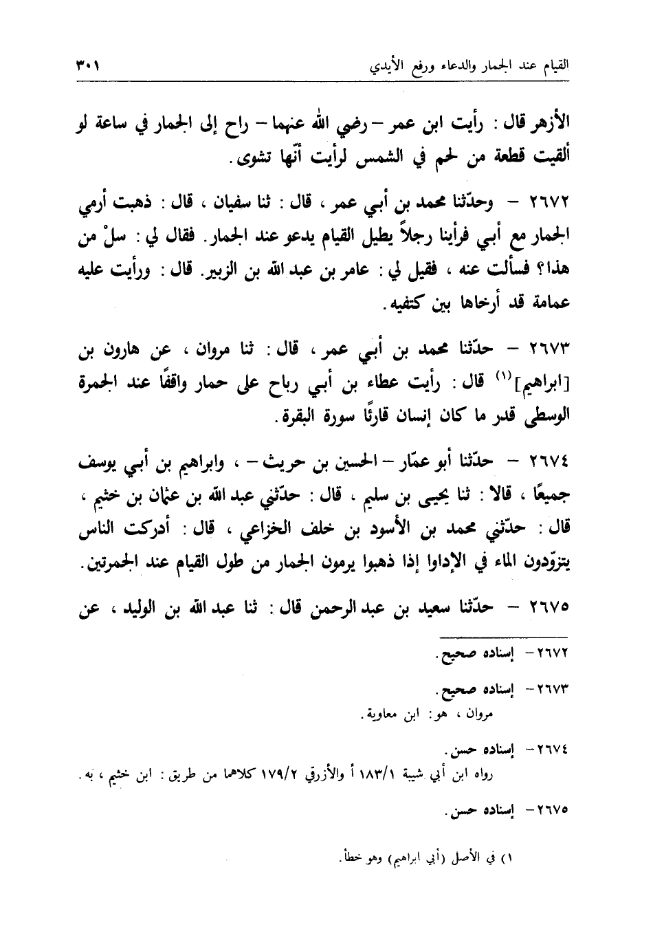 2718 - وَحَدَّثَنِي مُحَمَّدُ بْنُ الْعَلَاءِ أَخُو عَبْدِ الْجَبَّارِ بْنِ الْعَلَاءِ قَالَ: ثنا أَبِي قَالَ: ثنا نَافِعُ بْنُ عُمَرَ، عَنْ سَعِيدِ بْنِ حَسَّانَ قَالَ: " إِنَّ عَبْدَ اللهِ بْنَ عُمَرَ رَضِيَ اللهُ عَنْهُمَا كَانَ §يَنْزِلُ الْغَارَ مِنْ نَمِرَةَ الَّذِي كَانَ يَنْزِلُ رَسُولُ اللهِ صَلَّى اللَّهُ عَلَيْهِ وَسَلَّمَ وَالْغَارُ دَاخِلَ حَدِّ دَارِ الْإِمَارَةِ فِي بَيْتٍ فِي الدَّارِ. وَمِنَ الْغَارِ إِلَى مَسْجِدِ عَرَفَةَ أَلْفُ ذِرَاعٍ وَإِحْدَى عَشْرَةَ أُصْبُعًا. وَمِنْ مَسْجِدِ عَرَفَةَ إِلَى مَوْقِفِ الْإِمَامِ عَشِيَّةَ عَرَفَةَ مِيلٌ، يَكُونُ الْمِيلُ خَلْفَ الْإِمَامِ إِذَا وَقَفْتَ، وَهُوَ حَبْلُ الْمُشَاةِ