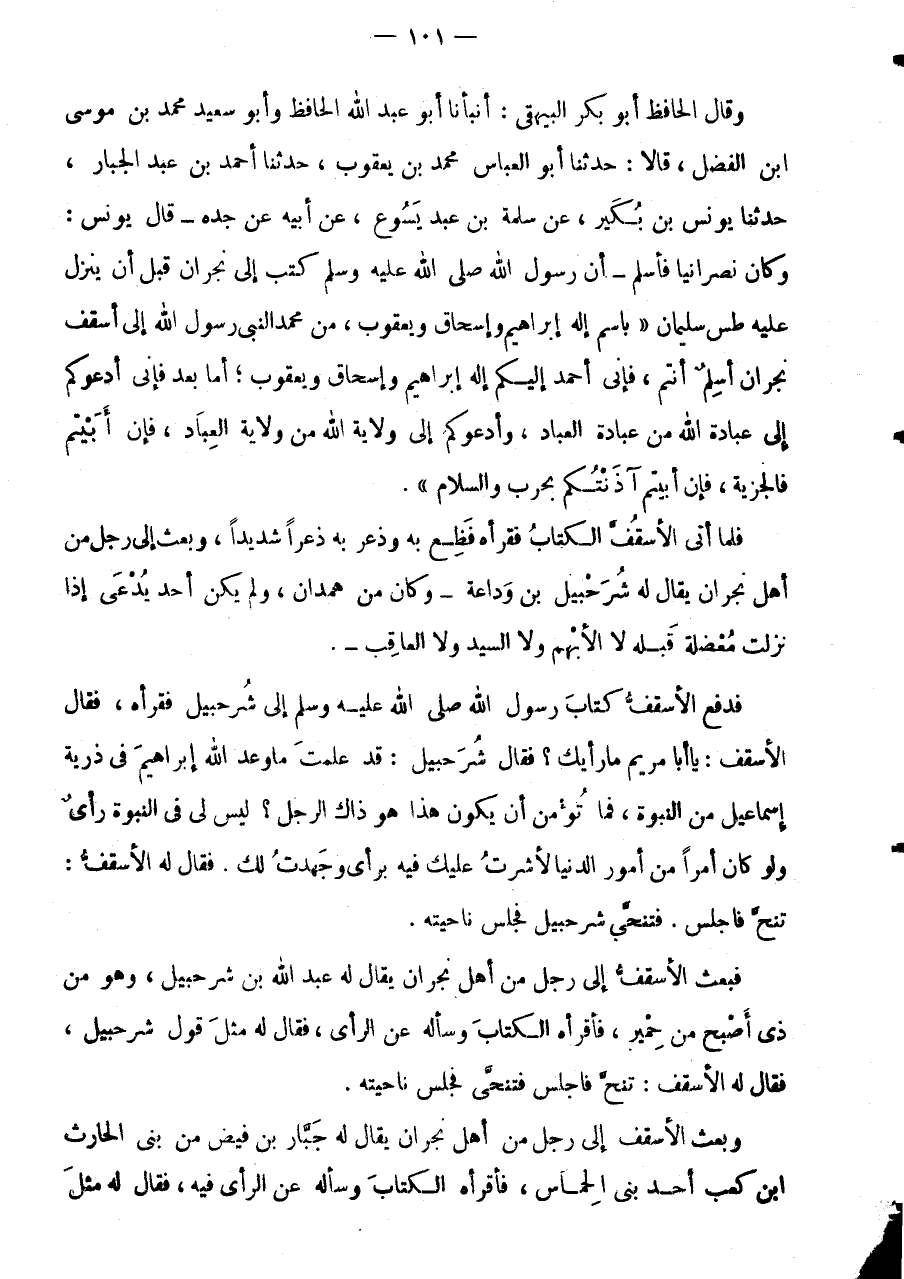 ابْن الْفضل، قَالَا: حَدَّثَنَا أَبُو الْعَبَّاسِ مُحَمَّدُ بْنُ يَعْقُوبَ، حَدَّثَنَا أَحْمَدُ بْنُ عَبْدِ الْجَبَّارِ، حَدَّثَنَا يُونُسُ بْنُ بُكَيْرٍ، عَنْ سَلَمَةَ بْنِ عَبْدِ يَسُوعَ، عَنْ أَبِيهِ عَنْ جَدِّهِ - قَالَ يُونُسُ: وَكَانَ نَصْرَانِيًّا فَأَسْلَمَ - أَنَّ رَسُولَ اللَّهِ صَلَّى اللَّهُ عَلَيْهِ وَسَلَّمَ كتب إِلَى نَجْرَانَ قَبْلَ أَنْ يَنْزِلَ عَلَيْهِ طس سُلَيْمَانَ " بِاسْمِ إِلَهِ إِبْرَاهِيمَ وَإِسْحَاقَ وَيَعْقُوبَ، مِنْ مُحَمَّدٍ النَّبِي رَسُول الله إِلَى أَسْقُف نَجْرَان أسلم أَنْتُم، فَإِنِّي أَحْمَدُ إِلَيْكُمْ إِلَهَ إِبْرَاهِيمَ وَإِسْحَاقَ وَيَعْقُوبَ ; أَمَّا بَعْدُ فَإِنِّي أَدْعُوكُمْ إِلَى عِبَادَةِ اللَّهِ مِنْ عِبَادَةِ الْعِبَادِ، وَأَدْعُوكُمْ إِلَى وِلَايَةِ اللَّهِ مِنْ وِلَايَةِ الْعِبَادِ فَإِنْ أَبَيْتُمْ فَالْجِزْيَةُ، فَإِنْ أَبَيْتُمْ آذَنْتُكُمْ بِحَرْبٍ وَالسَّلَامُ ".