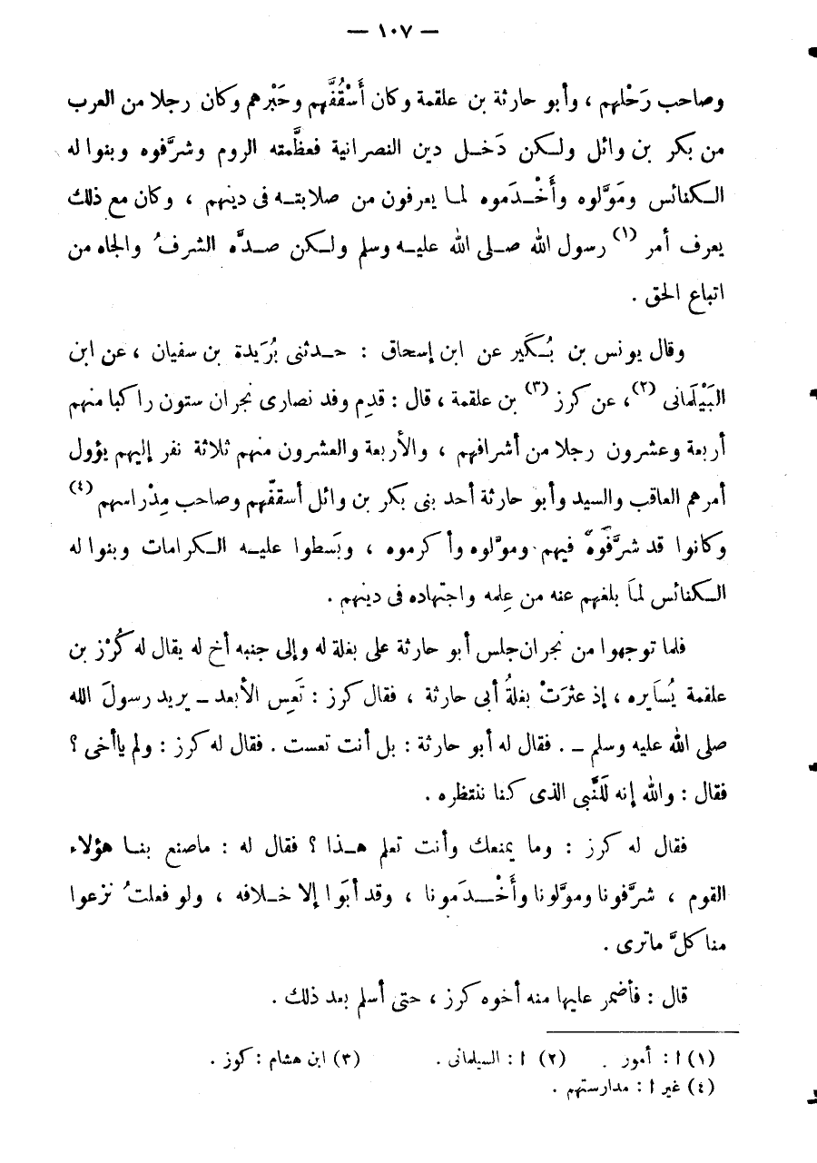 وَصَاحِبَ رَحْلِهِمْ، وَأَبُو حَارِثَةَ بْنُ عَلْقَمَةَ وَكَانَ أُسْقُفَّهُمْ وَحَبْرَهُمْ وَكَانَ رَجُلًا مِنَ الْعَرَبِ مِنْ بكر بن وَائِل وَلَكِن دخل دِينِ النَّصْرَانِيَّةِ فَعَظَّمَتْهُ الرُّومُ وَشَرَّفُوهُ وَبَنَوْا لَهُ الْكَنَائِسَ وَمَوَّلُوهُ وَأَخْدَمُوهُ لِمَا يَعْرِفُونَ مِنْ صَلَابَتِهِ فِي دِينِهِمْ، وَكَانَ مَعَ ذَلِكَ يَعْرِفُ أَمْرَ (1) رَسُولِ اللَّهِ صَلَّى اللَّهُ عَلَيْهِ وَسَلَّمَ وَلَكِن صده الشّرف والجاه من