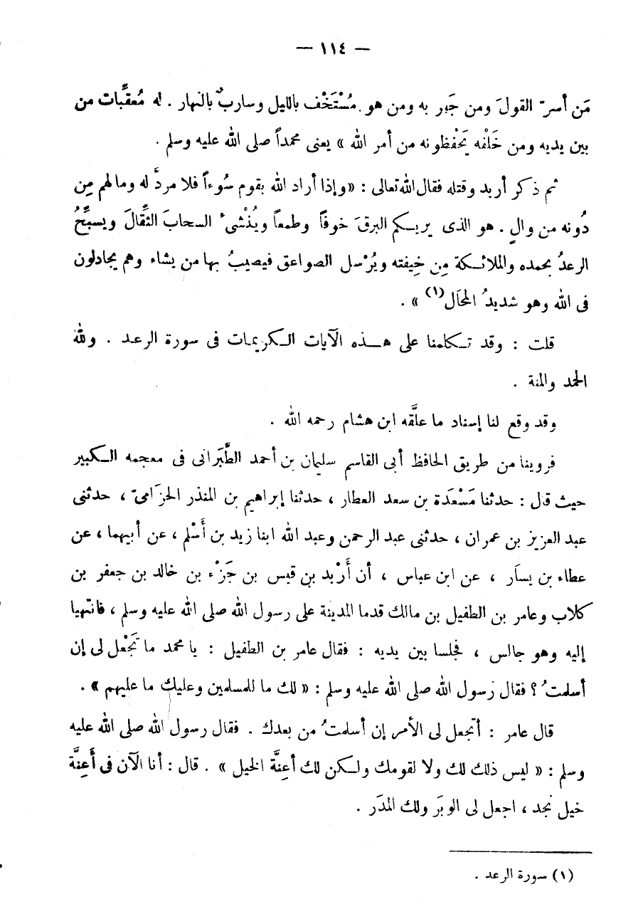 فَرَوَيْنَا مِنْ طَرِيقِ الْحَافِظِ أَبِي الْقَاسِمِ سُلَيْمَانَ بْنِ أَحْمَدَ الطَّبَرَانِيِّ فِي مُعْجَمِهِ الْكَبِيرِ حَيْثُ قَالَ: حَدَّثَنَا مَسْعَدَةُ بْنُ سَعْدٍ الْعَطَّارُ، حَدَّثَنَا إِبْرَاهِيمُ بْنُ الْمُنْذِرِ الْحِزَامِيُّ، حَدَّثَنِي عَبْدُ الْعَزِيزِ بْنُ عِمْرَانَ، حَدَّثَنِي عَبْدُ الرَّحْمَنِ وَعَبْدُ اللَّهِ ابْنَا زَيْدِ بْنِ أَسْلَمَ، عَنْ أَبِيهِمَا، عَنْ عَطَاءِ بْنِ يَسَارٍ، عَنِ ابْنِ عَبَّاسٍ، أَنَّ أَرْبَدَ بْنَ قَيْسِ بْنِ جَزْءِ بْنِ خَالِدِ بْنِ جَعْفَرِ بْنِ كِلَابٍ وَعَامِرَ بْنَ الطُّفَيْلِ بْنِ مَالِكٍ قَدِمَا الْمَدِينَةَ عَلَى رَسُولِ اللَّهِ صَلَّى اللَّهُ عَلَيْهِ وَسَلَّمَ، فَانْتَهَيَا إِلَيْهِ وَهُوَ جَالِسٌ، فَجَلَسَا بَيْنَ يَدَيْهِ: فَقَالَ عَامِرُ بْنُ الطُّفَيْلِ، يَا مُحَمَّدُ مَا تَجْعَلُ لِي إِنْ