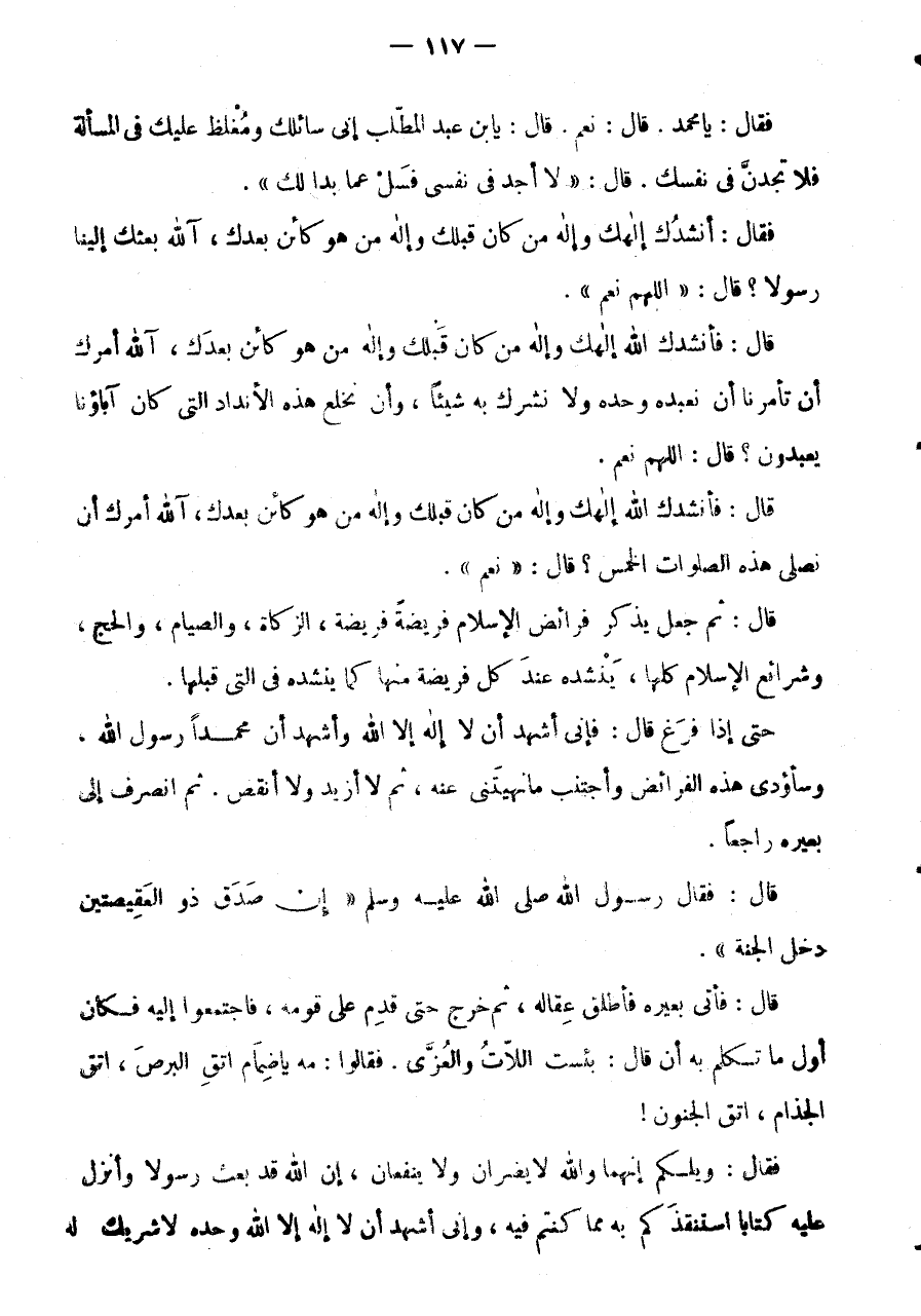 قَالَ: فَأَنْشُدُكَ اللَّهَ إِلَهَكَ وَإِلَهَ مَنْ كَانَ قَبْلَكَ وَإِلَهَ مَنْ هُوَ كَائِنٌ بَعْدَكَ، آللَّهُ أَمَرَكَ أَنَّ تَأْمُرَنَا أَنْ نَعْبُدَهُ وَحْدَهُ وَلَا نُشْرِكَ بِهِ شَيْئًا، وَأَنْ نَخْلَعَ هَذِهِ الْأَنْدَادَ الَّتِي كَانَ آبَاؤُنَا يَعْبُدُونَ؟ قَالَ: اللَّهُمَّ نَعَمْ.