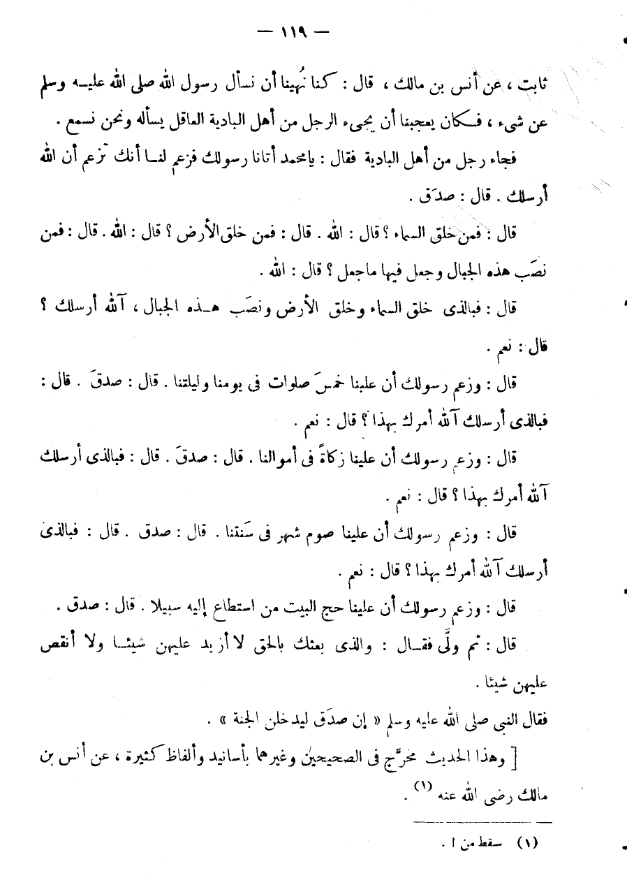 قَالَ: ثُمَّ وَلَّى فَقَالَ: والذى بَعثك بِالْحَقِّ لَا أَزِيد عَلَيْهِنَّ شَيْئا وَلَا أنقص عَلَيْهِنَّ شَيْئًا.
