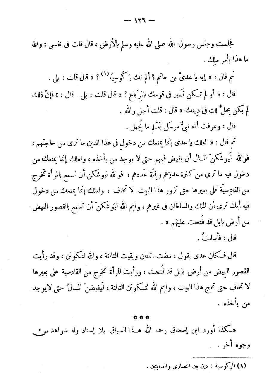ثُمَّ قَالَ: " لَعَلَّكَ يَا عَدِيُّ إِنَّمَا يَمْنَعُكَ مِنْ دُخُولٍ فِي هَذَا الدِّينِ مَا تَرَى مِنْ حَاجَتِهِمْ، فَوَاللَّهِ لَيُوشِكَنَّ الْمَالُ أَنْ يَفِيضَ فِيهِمْ حَتَّى لَا يُوجَدَ مَنْ يَأْخُذُهُ، وَلَعَلَّكَ إِنَّمَا يَمْنَعُكَ مِنْ دُخُولٍ فِيهِ مَا تَرَى مِنْ كَثْرَةِ عَدُوِّهِمْ وَقِلَّةِ عَدَدِهِمْ، فَوَاللَّهِ لَيُوشِكَنَّ أَنْ تَسْمَعَ بِالْمَرْأَةِ تَخْرُجُ مِنَ الْقَادِسِيَّةِ عَلَى بَعِيرِهَا حَتَّى تَزُورَ هَذَا الْبَيْتَ لَا تَخَافُ، وَلَعَلَّكَ إِنَّمَا يَمْنَعُكَ مِنْ دُخُولٍ فِيهِ أَنَّكَ تَرَى أَنَّ الْمُلْكَ وَالسُّلْطَانَ فِي غَيْرِهِمْ، وَايْمُ اللَّهِ لَيُوشِكَنَّ أَنْ تَسْمَعَ بِالْقُصُورِ الْبِيضِ مِنْ أَرْضِ بَابِلَ قَدْ فُتِحَتْ عَلَيْهِمْ ".