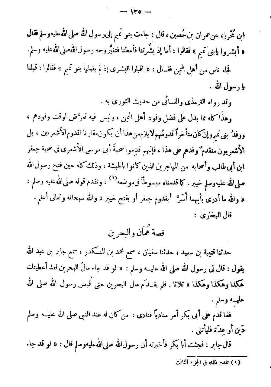 قَالَ البُخَارِيّ: قصَّة عمان والبحرين حَدثنَا قُتَيْبَة بن سعيد، حَدثنَا سُفْيَانُ، سَمِعَ مُحَمَّدَ بْنَ الْمُنْكَدِرِ، سَمِعَ جَابِرَ بْنَ عَبْدِ اللَّهِ يَقُولُ: قَالَ لِي رَسُولُ اللَّهِ صَلَّى اللَّهُ عَلَيْهِ وَسَلَّمَ: " لَوْ قَدْ جَاءَ مَالُ الْبَحْرَيْنِ لَقَدْ أَعْطَيْتُكَ هَكَذَا وَهَكَذَا وَهَكَذَا " ثَلَاثًا.