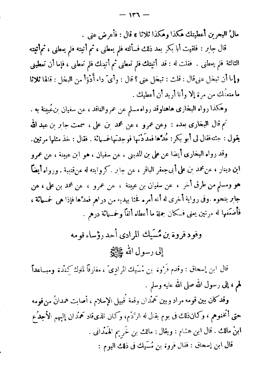 وُفُودُ فَرْوَةَ بْنِ مسيك المرادى أَحَدِ رُؤَسَاءِ قَوْمِهِ إِلَى رَسُولِ اللَّهِ صَلَّى اللَّهُ عَلَيْهِ وَسَلَّمَ قَالَ ابْنُ إِسْحَاقَ: وَقَدِمَ فَرْوَةُ بْنُ مُسَيْكٍ الْمُرَادِيُّ، مُفَارِقًا لِمُلُوكِ كِنْدَةَ وَمُبَاعِدًا لَهُمْ، إِلَى رَسُولِ اللَّهِ صَلَّى اللَّهُ عَلَيْهِ وَسَلَّمَ.