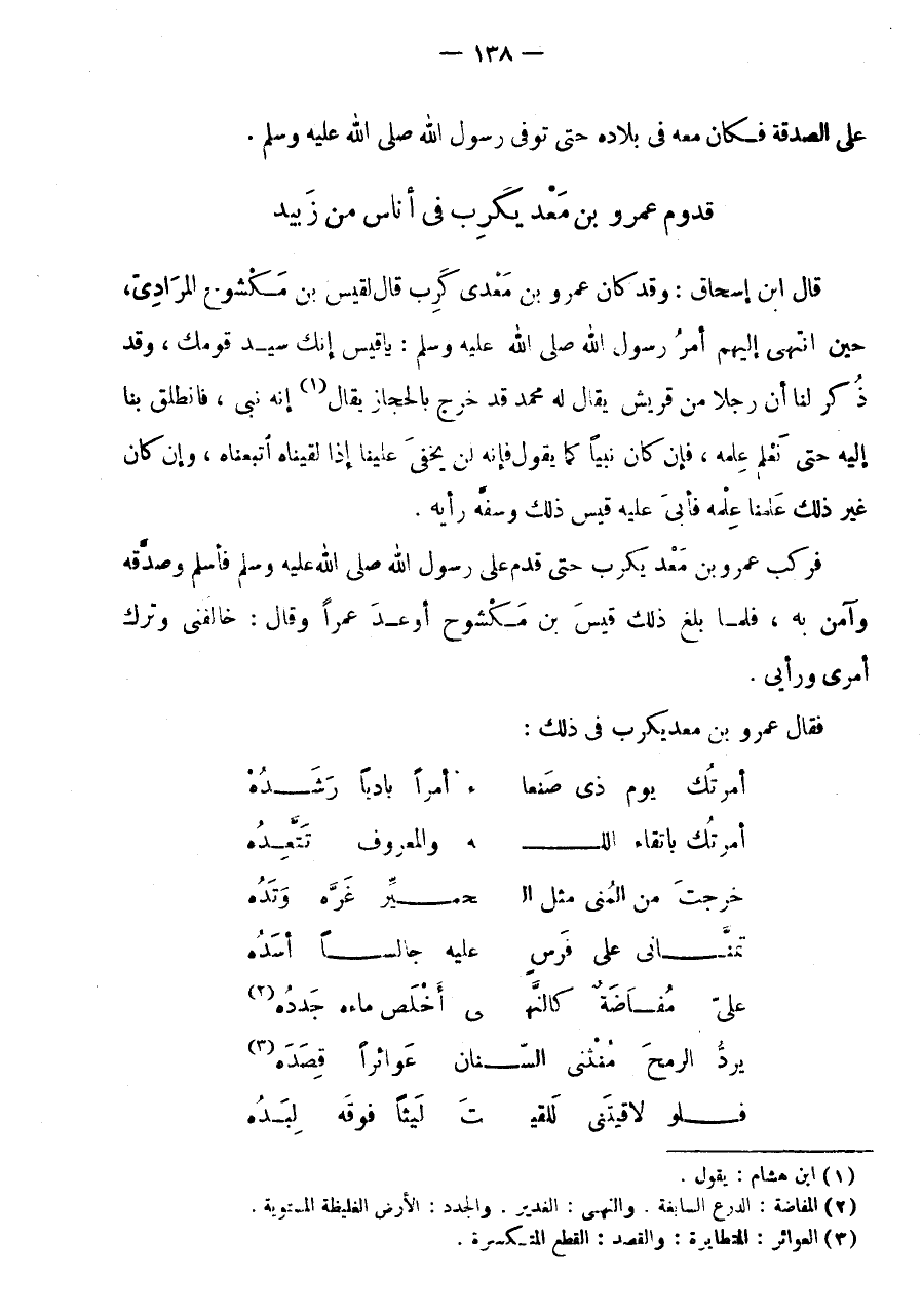 قَالَ ابْنُ إِسْحَاقَ: وَقد كَانَ عَمْرو بن معدى كرب قَالَ لِقَيْسِ بْنِ مَكْشُوحٍ الْمُرَادِيِّ، حِينَ انْتَهَى إِلَيْهِمْ أَمْرُ رَسُولُ اللَّهِ صَلَّى اللَّهُ عَلَيْهِ وَسَلَّمَ: يَا قَيْسُ إِنَّكَ سَيِّدُ قَوْمِكَ، وَقَدْ ذُكِرَ لَنَا أَنَّ رَجُلًا مِنْ قُرَيْشٍ يُقَالُ لَهُ مُحَمَّدٌ قَدْ خَرَجَ بِالْحِجَازِ يُقَالُ (1) إِنَّهُ نَبِيٌّ، فَانْطَلِقْ بِنَا إِلَيْهِ حَتَّى نَعْلَمَ عِلْمَهُ، فَإِنْ كَانَ نَبِيًّا كَمَا يَقُولُ فَإِنَّهُ لَنْ يخفى علينا إِذا لَقِينَاهُ اتَّبَعْنَاهُ، وَإِنْ كَانَ غَيْرَ ذَلِكَ عَلِمْنَا عِلْمَهُ فَأَبَى عَلَيْهِ قَيْسٌ ذَلِكَ وَسَفَّهَ رَأْيَهُ.