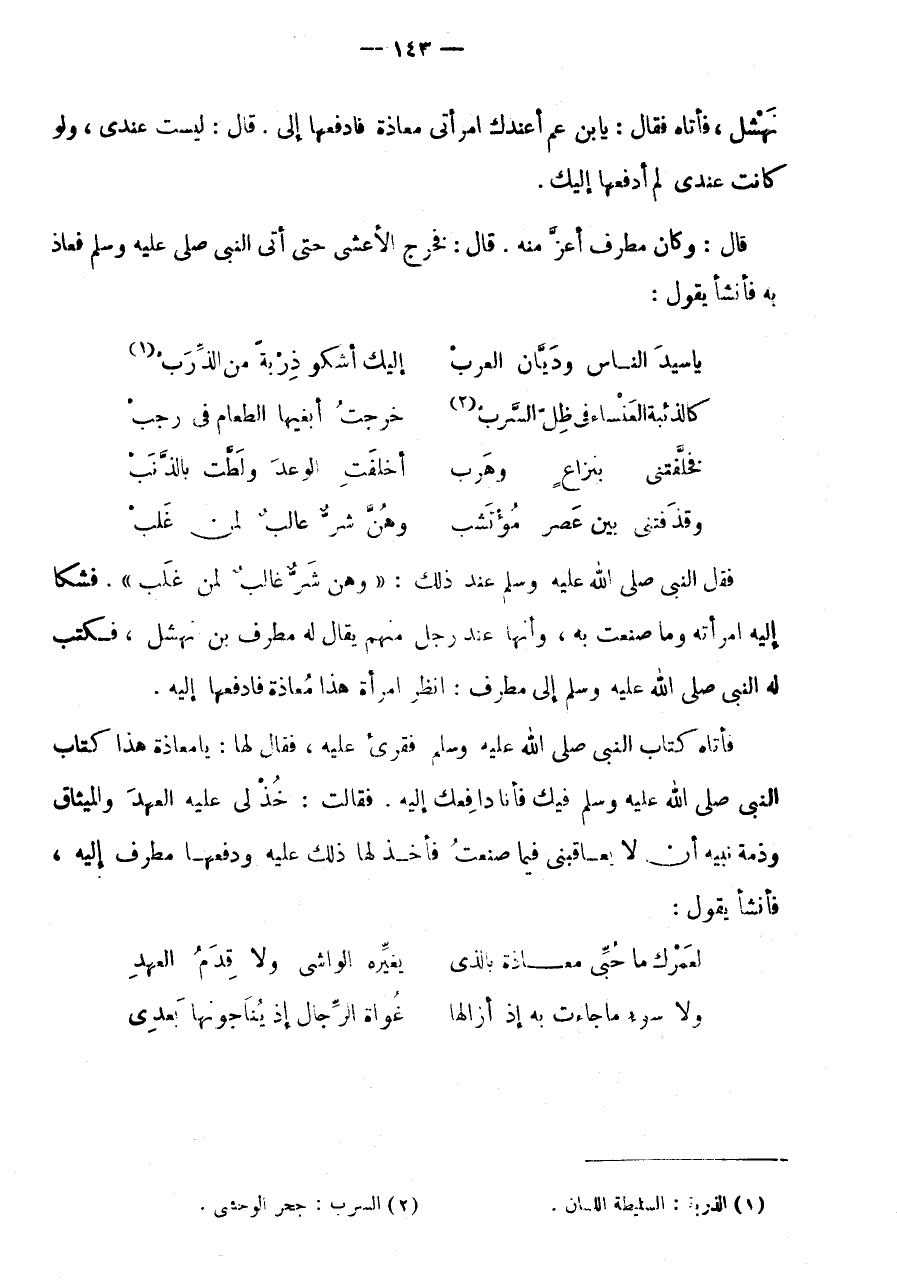 قَالَ: فَخرج الاعشى حَتَّى أَتَى النَّبِي صلى عَلَيْهِ وَسلم فعاذ بِهِ فَأَنْشَأَ يَقُولُ: يَا سَيِّدَ النَّاسِ وَدَيَّانَ الْعَرَبْ * إِلَيْكَ أَشْكُو ذربة من الذرب (1) كالذئبة العنساء فِي ظِلِّ السَّرَبْ (2) * خَرَجْتُ أَبْغِيهَا الطَّعَامَ فِي رَجَبْ فَخَلَّفَتْنِي بِنِزَاعٍ وَهَرَبْ * أَخْلَفَتِ الْوَعْدَ وَلَطَّتْ بَالذَّنَبْ وَقَذَفَتْنِي بَيْنَ عَصْرٍ مُؤْتَشَبْ * وَهُنَّ شَرُّ غَالِبٍ لِمَنْ غَلَبْ فَقَالَ النَّبِيُّ صَلَّى اللَّهُ عَلَيْهِ وَسَلَّمَ عِنْدَ ذَلِكَ: " وَهُنَّ شَرُّ غَالِبٍ لمن غلب ".