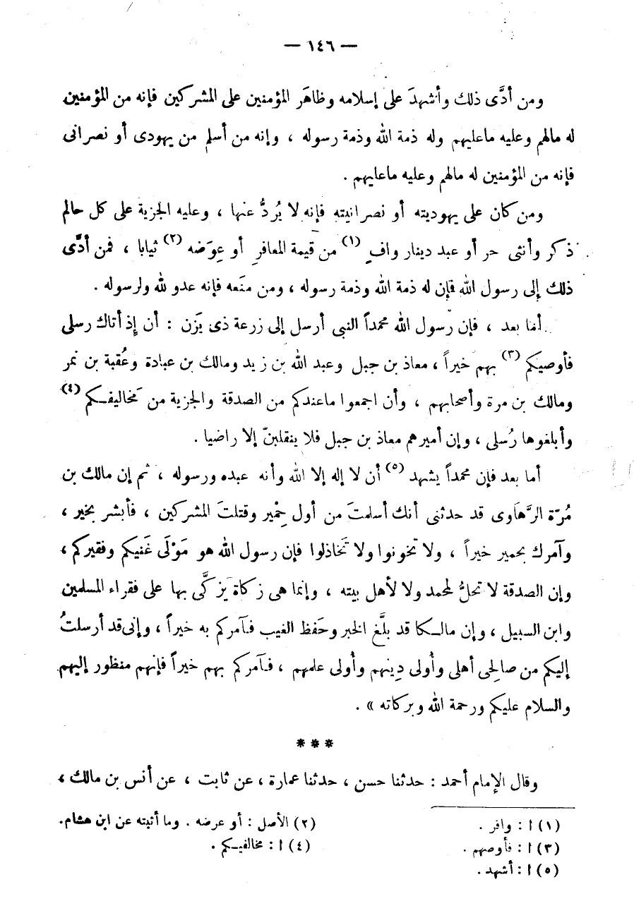 فَأُوصِيكُمْ (3) بِهِمْ خَيْرًا، مُعَاذُ بْنُ جَبَلٍ وَعَبْدُ اللَّهِ بْنُ زَيْدٍ وَمَالِكُ بْنُ عُبَادَةَ وَعُقْبَةُ بْنُ نَمِرٍ وَمَالِكُ بْنُ مُرَّةَ وَأَصْحَابُهُمْ، وَأَنِ اجْمَعُوا مَا عِنْدَكُمْ مِنَ الصَّدَقَةِ وَالْجِزْيَةِ مِنْ مَخَالِيفِكُمْ (4) وَأَبْلِغُوهَا رُسُلِي، وَإِنَّ أَمِيرَهُمْ مُعَاذُ بْنُ جَبَلٍ فَلَا يَنْقَلِبَنَّ إِلَّا رَاضِيًا.