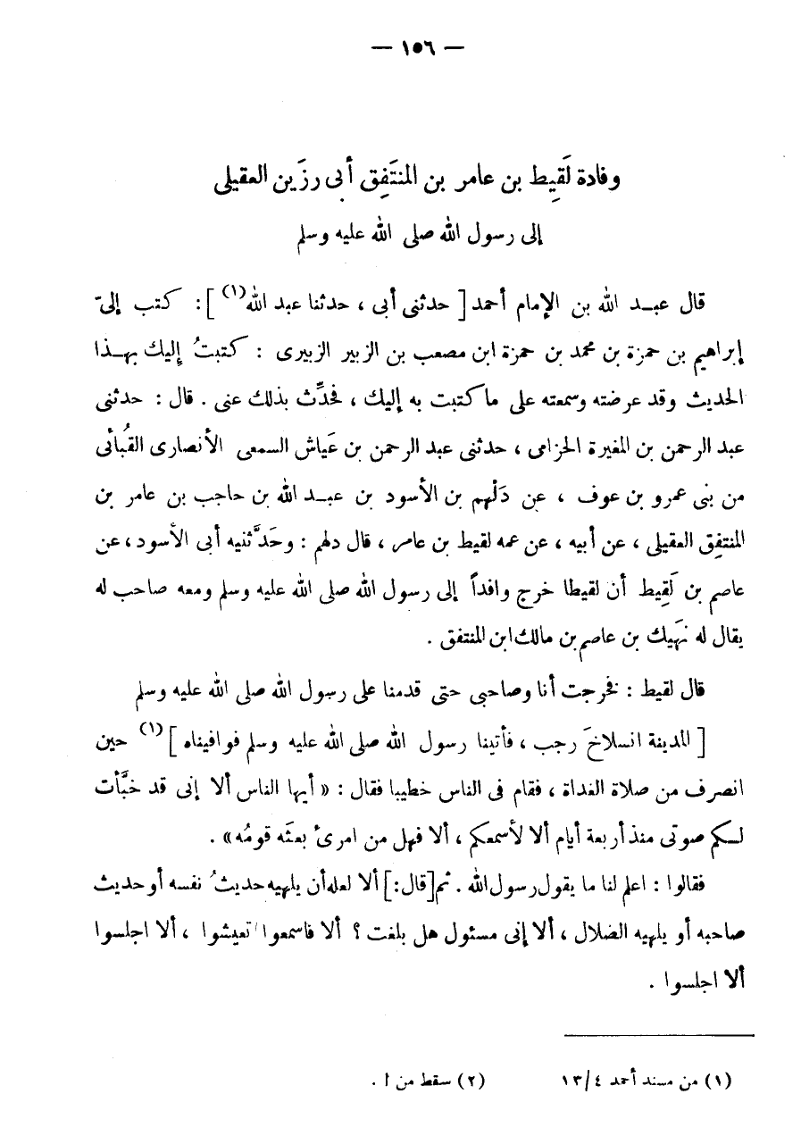 وفادة لَقِيط بن عَامر بن الْمُنْتَفِقِ أَبِي رَزِينٍ الْعُقَيْلِيِّ إِلَى رَسُولِ اللَّهِ صَلَّى اللَّهُ عَلَيْهِ وَسَلَّمَ قَالَ عَبْدُ اللَّهِ بن الامام أَحْمد [حَدَّثَنى أَبى، حَدثنَا عبد الله (1) ] : كَتَبَ إِلَيَّ إِبْرَاهِيمُ بْنُ حَمْزَةَ بْنِ مُحَمَّدِ بْنِ حَمْزَةَ ابْن مُصْعَبِ بْنِ الزُّبَيْرِ الزُّبَيْرِيُّ: كَتَبْتُ إِلَيْكَ بِهَذَا الْحَدِيثِ وَقَدْ عَرَضْتُهُ وَسَمِعْتُهُ عَلَى مَا كَتَبْتُ بِهِ إِلَيْكَ، فَحَدِّثْ بِذَلِكَ عَنِّي.