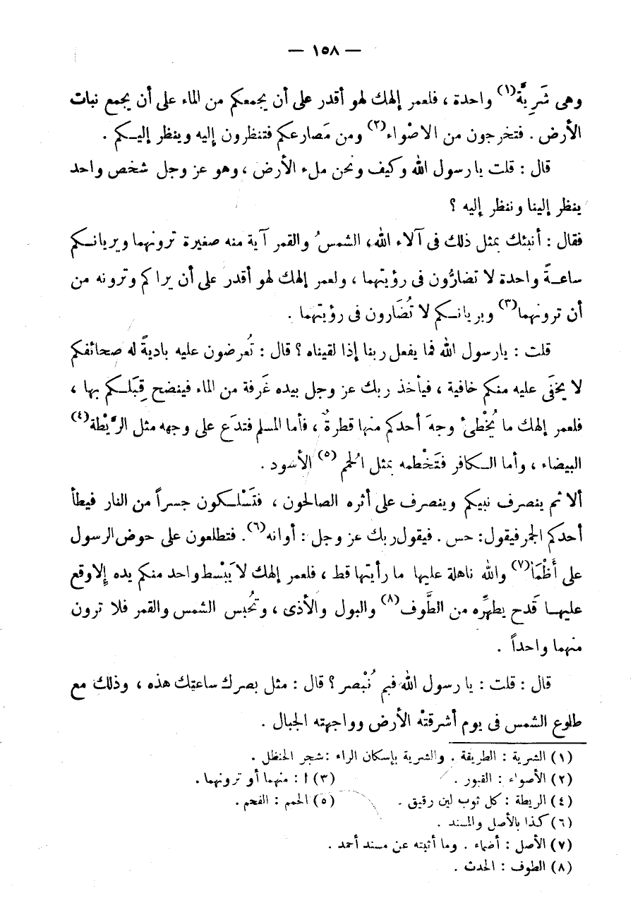 فَتَطْلُعُونَ عَلَى حَوْضِ الرَّسُولِ عَلَى أَظْمَأِ (7) وَاللَّهِ نَاهِلَةٍ عَلَيْهَا مَا رَأَيْتُهَا قَطُّ، فَلَعَمْرُ إِلَهِكَ لَا يَبْسُطُ وَاحِدٌ مِنْكُمْ يَدَهُ إِلَّا وَقَعَ عَلَيْهَا قَدَحٌ يُطَهِّرُهُ مِنَ الطَّوْفِ (8) وَالْبَوْلِ وَالْأَذَى، وَتُحْبَسُ الشَّمْسُ وَالْقَمَرُ فَلَا تَرَوْنَ مِنْهُمَا وَاحِدًا.